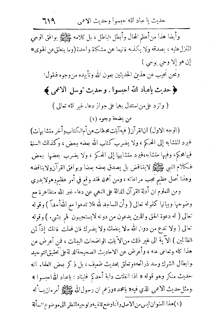 ومن المعلوم أن أدلة القرآن الدالة على النهي عن دعاء غير الله متظاهرة مع وضوحها وبيانها، كقوله تعالى: {وَأَنَّ الْمَسَاجِدَ لِلَّهِ فَلا تَدْعُو مَعَ اللَّهِ أَحَدًا} 4 وقوله تعالى: {لَهُ دَعْوَةُ الْحَقِّ وَالَّذِينَ يَدْعُونَ مِنْ دُونِهِ لا يَسْتَجِيبُونَ لَهُمْ بِشَيْءٍ} 5 وقوله تعالى: {لَهُ دَعْوَةُ الْحَقِّ وَالَّذِينَ يَدْعُونَ مِنْ دُونِهِ لا يَسْتَجِيبُونَ لَهُمْ بِشَيْءٍ} 6 الآية. إلى غير ذلك من الآيات الواضحات البينات. فمن أعرض عن هذا كله وَتَعَامَى عنه، وأعرض عن الأحاديث الصحيحة الدالة على تحقيق التوحيد وإبطال الشرك وسد ذرائعه، وتعلق بحديث ضعيف، بل ذكر بعض العلماء أنه حديث منكر، وهو قوله: "إذا انفلتَتْ دابة أحدكم فليناد: يا عباد الله احبسوا" ومثل حديث الأعمى الذي فيه: "يا محمد" وزعم أن رسول الله صلى الله عليه وسلم أمره أن يسأله