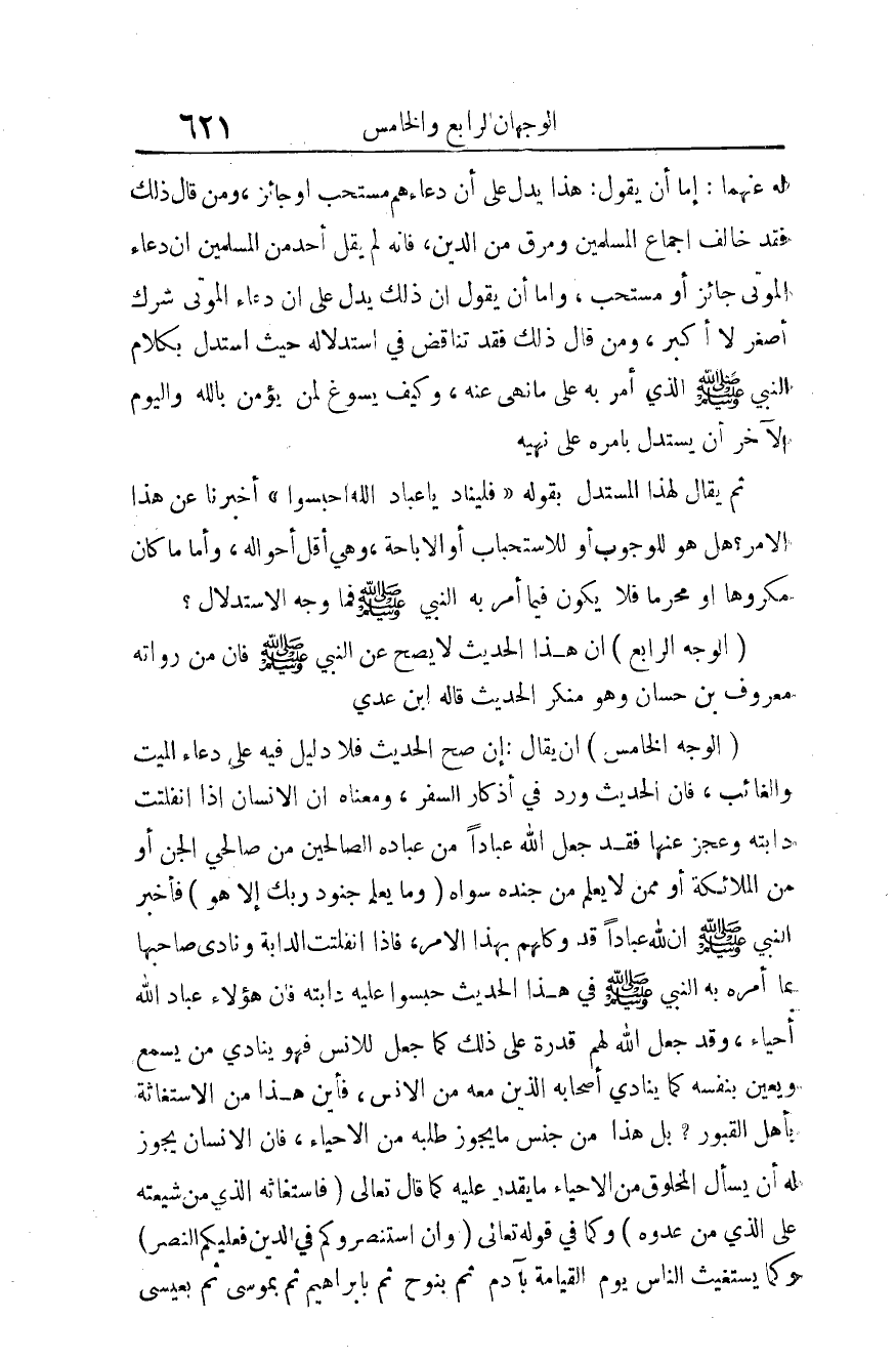 "الوجه الخامس": أن يقال: إن صح الحديث فلا دليل فيه على دعاء الميت والغائب، فإن الحديث ورد في أذكار السفر، ومعناه: أن الإنسان إذا انفلتت دابته، وعجز عنها فقد جعل الله عبادا من عباده الصالحين من صالحي الجن أو من الملائكة أو ممن لا يعلم من جنده سواه: {مَا يَعْلَمُ جُنُودَ رَبِّكَ إِلَّا هُوَ} 1 فأخبر النبي صلى الله عليه وسلم أن لله عبادا قد وكلهم بهذا الأمر، فإذا انفلتت الدابة، ونادى صاحبها بما أمره به النبي صلى الله عليه وسلم في هذا الحديث: حبسوا عليه دابته.