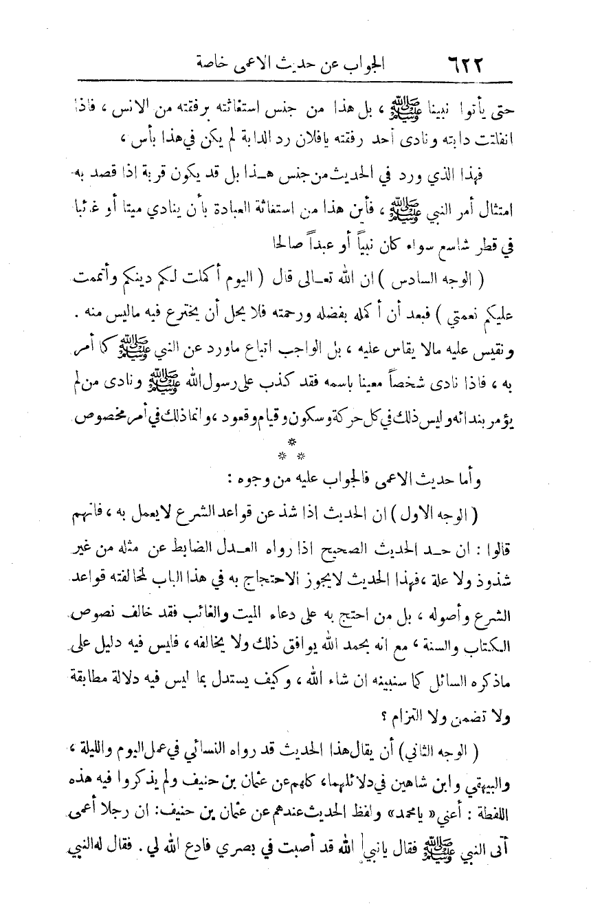 "الوجه الثاني" أن يقال: هذا الحديث قد رواه النسائي في عمل اليوم والليلة، والبيهقي وابن شاهين في دلائلهما، كلهم عن عثمان بن حنيف، ولم يذكروا فيه هذه اللفظة: أعني: "يا محمد" ولفظ الحديث عندهم عن عثمان بن حنيف: أن رجلا أعمى أتى النبي -صلى الله عليه وسلم- فقال يا نبي الله قد أُصِبْتُ في بصري فادعُ الله لي. فقال له النبي