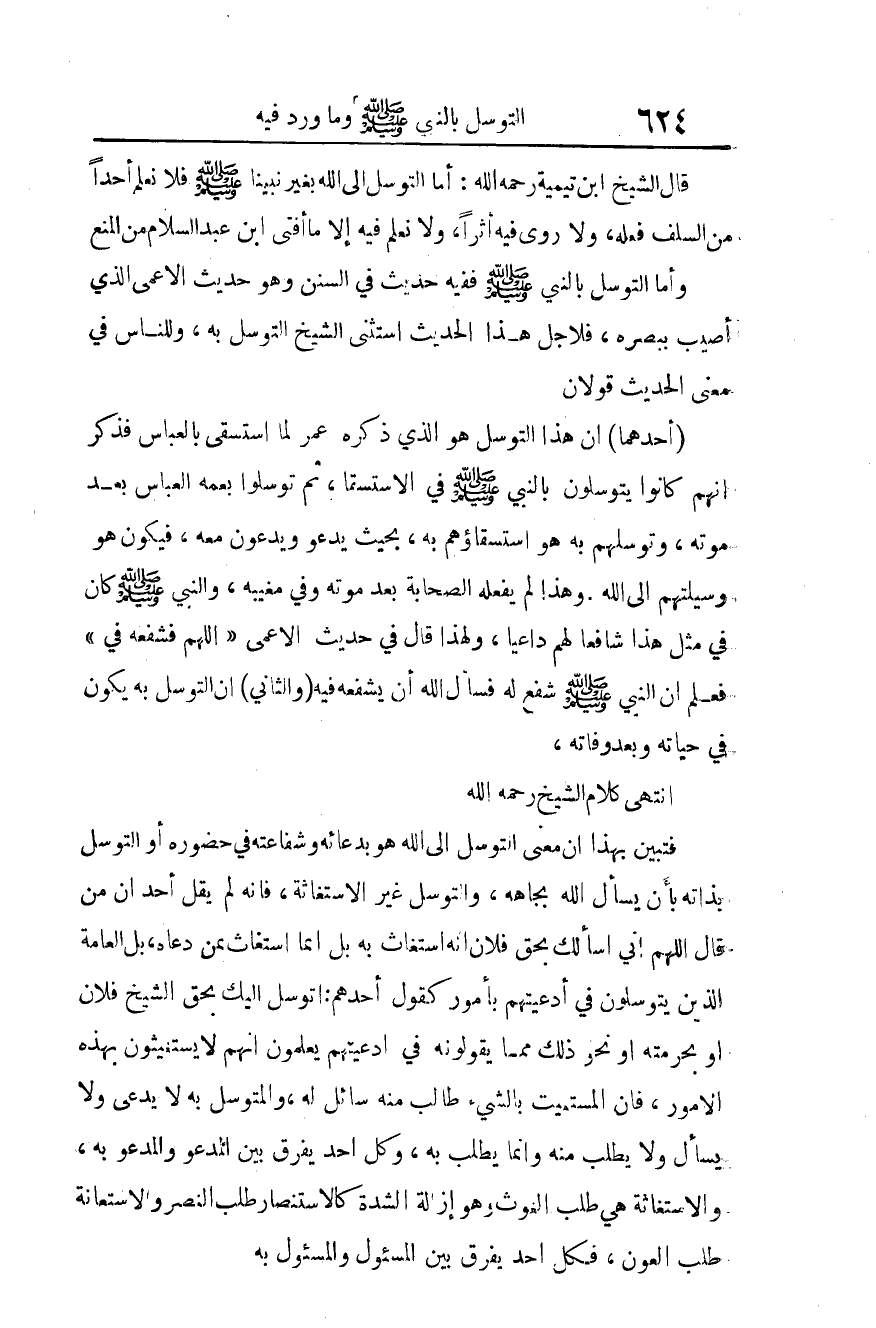 "أحدهما" أن هذا التوسل هو الذي ذكره عمر لما استسقى بالعباس فذكر أنهم كانوا يتوسلون بالنبي -صلى الله عليه وسلم- في الاستسقاء، ثم توسلوا بعمه العباس بعد موته، وتوسلهم به هو استسقاؤهم به، بحيث يدعو ويدعون معه، فيكون هو وسيلتهم إلى الله. وهذا لم يفعله الصحابة بعد موته وفي مغيبه، والنبي -صلى الله عليه وسلم- كان في مثل هذا شافعا لهم داعيا، ولهذا قال في حديث الأعمى: "اللهم فَشَفِّعْهُ فيَّ"1 فعلم أن النبي -صلى الله عليه وسلم- شفع له فسأل الله أن يُشَفِّعَهُ فيه. "والثاني" أن التوسل به يكون في حياته وبعد وفاته.