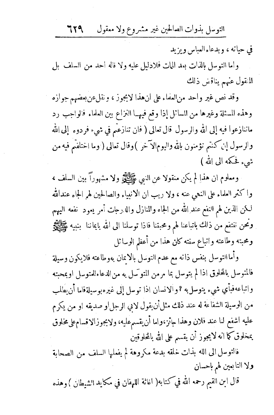 ومعلوم أن هذا لم يكن منقولا عن النبي صلى الله عليه وسلم ولا مشهورا بين السلف، وأكثر العلماء على النهي عنه، ولا ريب أن الأنبياء والصالحين لهم الجاه عند الله، لكن الذين لهم النفع عند الله من الجاه والمنازل والدرجات أمرٌ يعود نفعه إليهم، ونحن ننتفع من ذلك باتباعنا لهم ومحبتنا، فإذا توسلنا إلى الله بإيماننا بنبيه صلى الله عليه وسلم - ومحبته وطاعته واتباع سنته كان هذا من أعظم الوسائل.