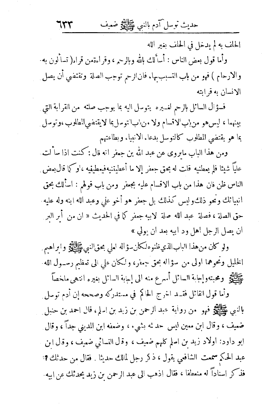 وأما قول القائل: فقد أخرج الحاكم في مستدركه، وصححه: "أن آدم توسل بالنبي صلى الله عليه وسلم" فهو من رواية عبد الرحمن بن زيد بن أسلم، قال أحمد بن حنبل: ضعيف، وقال ابن معين: ليس حديثه بشيء، وضعَّفَه ابن المديني جدا، وقال أبو داود: أولاد زيد بن أسلم كلهم ضعيف، وقال النسائي: ضعيف، وقال ابن عبد الحكم: سمعت الشافعي يقول: ذكر رجل لمالك حديثا. فقال من حَدَّثَك؟ فذكر إسنادا له منعطفا. فقال: اذهب إلى عبد الرحمن بن زيد يحدثك عن أبيه