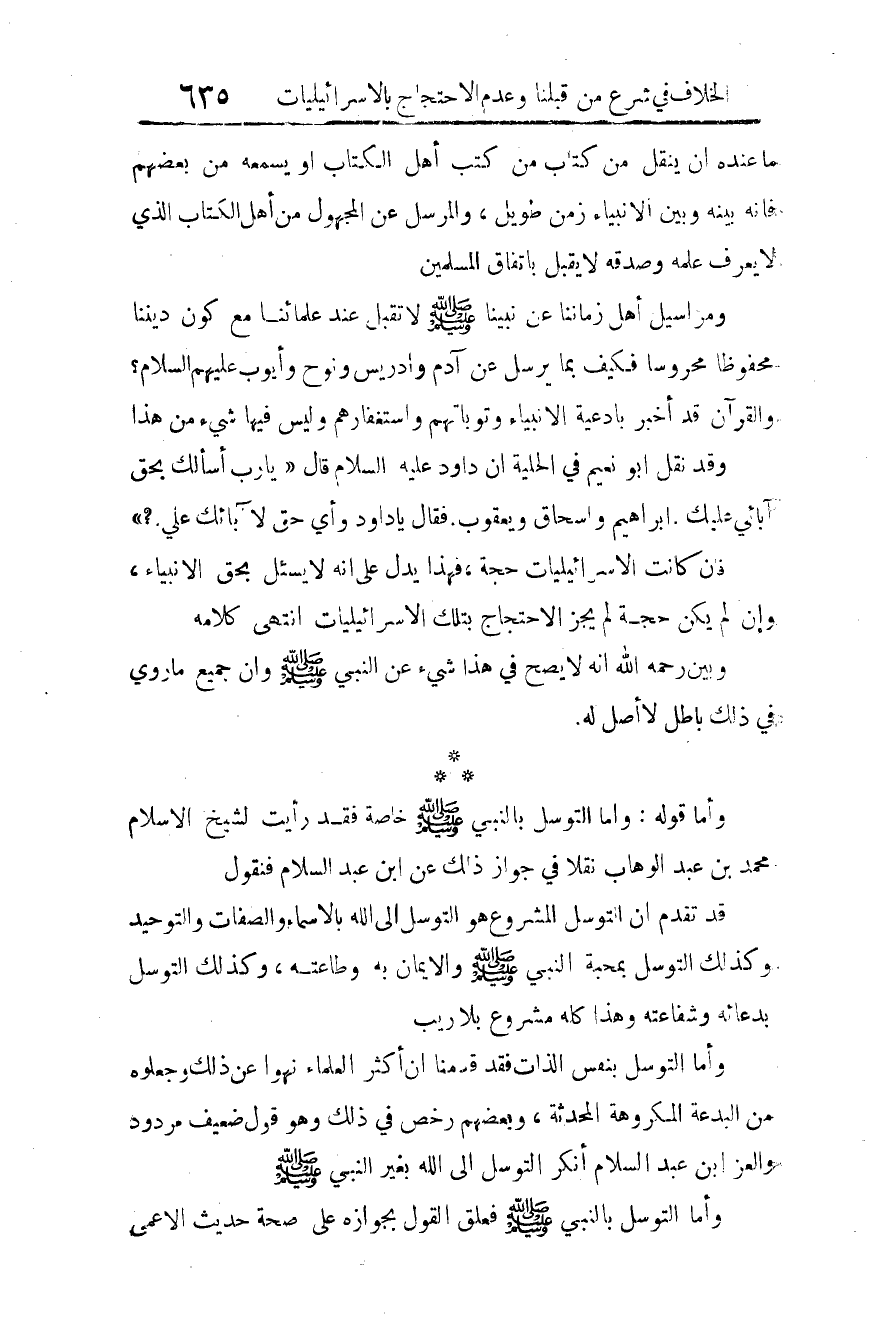 وأما قوله: وأما التوسل بالنبي صلى الله عليه وسلم خاصة، فقد رأيت لشيخ الإسلام محمد بن عبد الوهاب نقلا في جواز ذلك عن ابن عبد السلام.