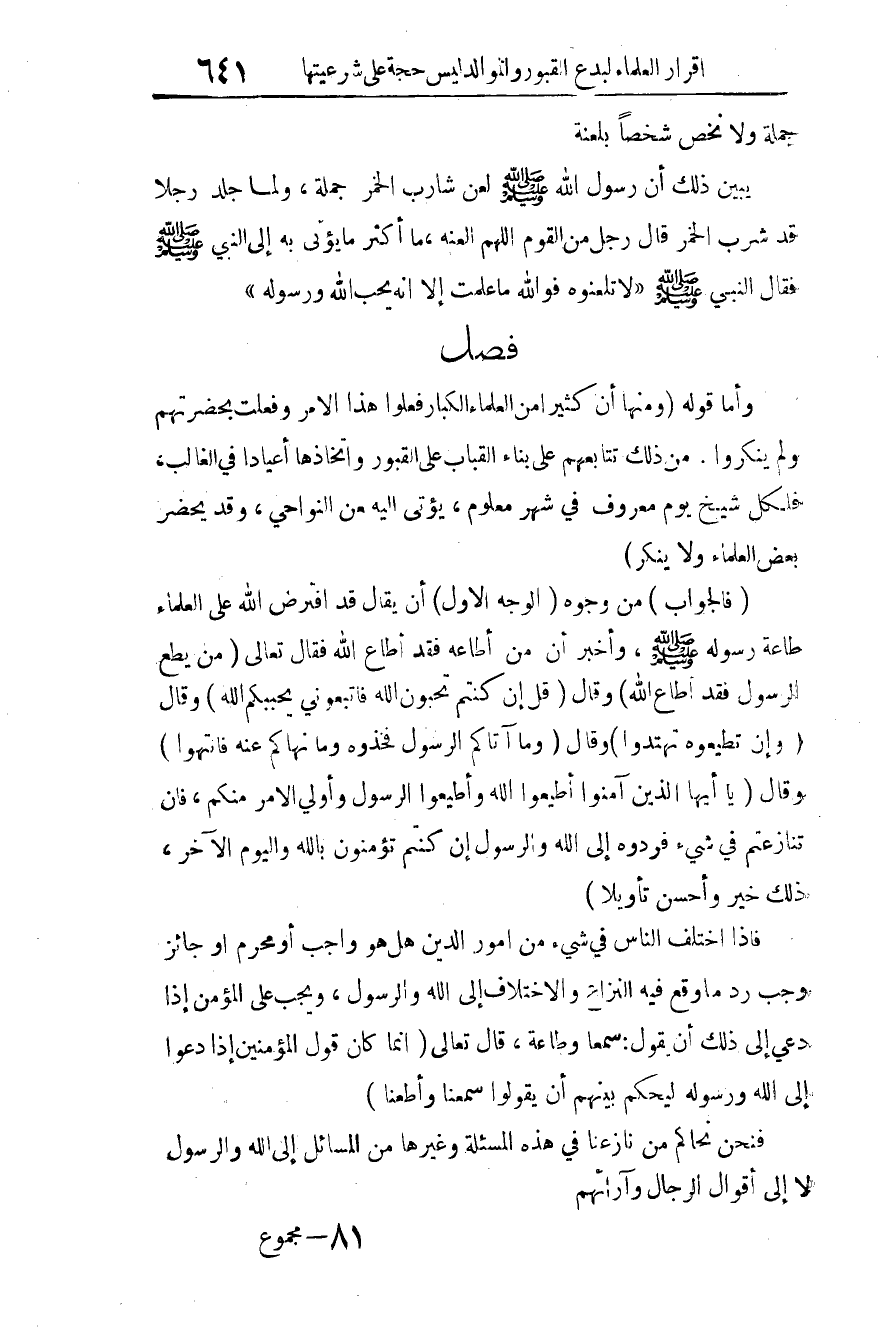 "فالجواب" من وجوه: "الوجه الأول" أن يقال: قد افترض الله على العلماء طاعة رسوله صلى الله عليه وسلم وأخبر أن من أطاعه فقد أطاع الله، فقال تعالى: {مَنْ يُطِعِ الرَّسُولَ فَقَدْ أَطَاعَ اللَّهَ} 2 وقال: {قُلْ إِنْ كُنْتُمْ تُحِبُّونَ اللَّهَ فَاتَّبِعُونِي يُحْبِبْكُمُ اللَّهُ} 3 وقال: {وَإِنْ تُطِيعُوهُ تَهْتَدُوا} 4 وقال: {وَمَا آتَاكُمُ الرَّسُولُ فَخُذُوهُ وَمَا نَهَاكُمْ عَنْهُ فَانْتَهُوا} 5 وقال: {يَا أَيُّهَا الَّذِينَ آمَنُوا أَطِيعُوا اللَّهَ وَأَطِيعُوا الرَّسُولَ وَأُولِي الْأَمْرِ مِنْكُمْ فَإِنْ تَنَازَعْتُمْ فِي شَيْءٍ فَرُدُّوهُ إِلَى اللَّهِ وَالرَّسُولِ إِنْ كُنْتُمْ تُؤْمِنُونَ بِاللَّهِ وَالْيَوْمِ الْآخِرِ ذَلِكَ خَيْرٌ وَأَحْسَنُ تَأْوِيلًا} 6.