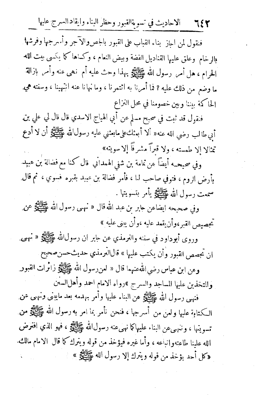 فنهى رسول الله صلى الله عليه وسلم عن البناء عليها، وأمر بهدمه بعد ما يُبْنَى، ونهى عن الكتابة عليها، ولعن من أسرجها، فنحن نأمر بما أمر به رسول الله صلى الله عليه وسلم من تسويتها، وننهى عن البناء عليها، كما نهى عنه رسول الله صلى الله عليه وسلم فهو الذي افترض الله علينا طاعته واتباعه، وأما غيره فَيُؤْخَذُ من قوله ويُتْرَكُ، كما قال الإمام مالك: "كل أحد يؤخذ من قوله ويترك إلا رسول الله -صلى الله عليه وسلم -".