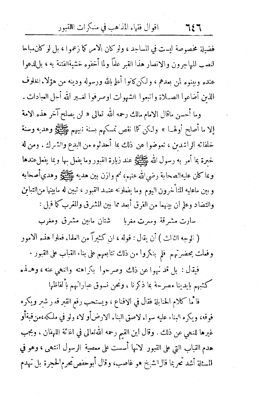 وما أحسن ما قال الإمام مالك -رحمه الله تعالى-: "لن يُصْلِح آخر هذه الأمة إلا ما أصلح أولها"ولكن كلما نقص تمسكهم بسنة نبيهم صلى الله عليه وسلم وهديه وسنة خلفائه الراشدين، تَعَوَّضُوا عن ذلك بما أحدثوه من البدع والشرك. ومن له خبرةٌ بما أمر به رسول الله صلى الله عليه وسلم عند زيارة القبور، وما يُفْعَل بها، وبما يفعل عندها، وبما كان عليه الصحابة -رضي الله عنهم-، ثم وَازن بين هديه صلى الله عليه وسلم وهدي أصحابه وبين ما عليه المتأخرون اليوم، وما يفعلونه عند القبور، تبين له ما بينها من التباين والتضاد، وعلم أن بينهما من الفرق أبعد مما بين المشرق والمغرب كمل قيل: