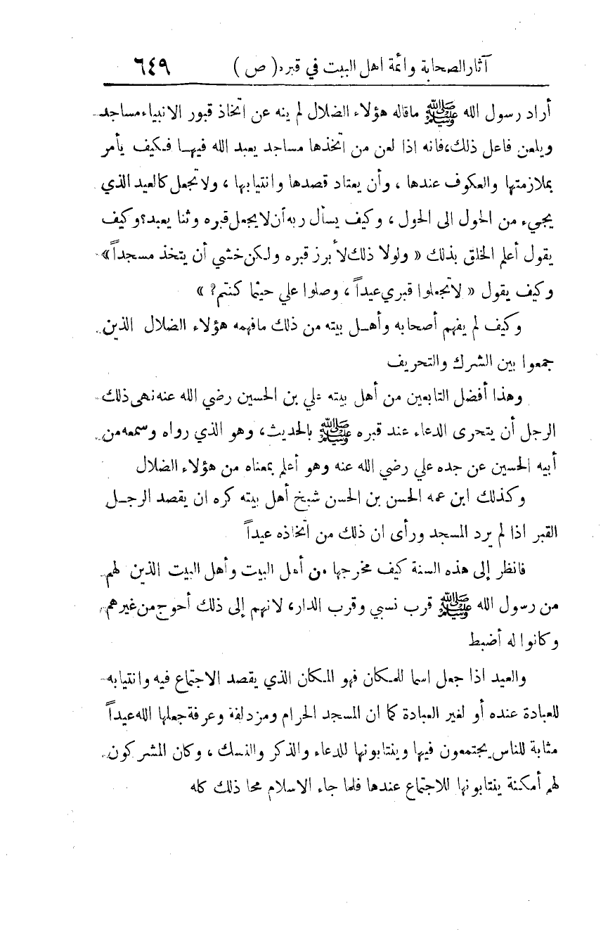 وهذا أفضل التابعين من أهل بيته علي بن الحسين -رضي الله عنه- نهى ذلك الرجل أن يتحرى الدعاء عند قبره -صلى الله عليه وسلم- بالحديث، وهو الذي رواه وسمعه من أبيه الحسين عن جده علي رضي الله عنه وهو أعلم بمعناه من هؤلاء الضلال.