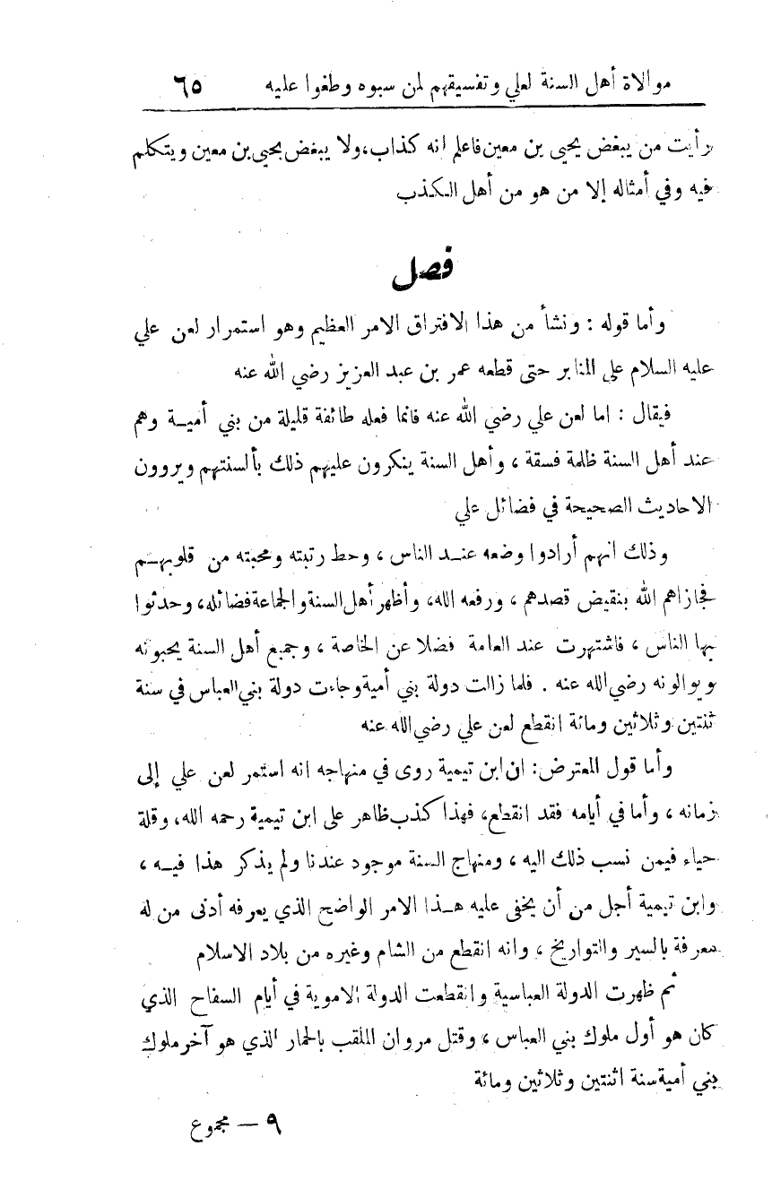 وأما قول المعترض: أن ابن تيمية روى في منهاجه أنه استمر لعن علي إلى زمانه، وأما في أيامه فقد انقطع، فهذا كذب ظاهر على ابن تيمية -رحمه الله-، وقلة حياء فيمن نسب ذلك إليه، ومنهاج السنة موجود عندنا، ولم يذكر هذا فيه، وابن تيمية أجل من أن يخفى عليه هذا الأمر الواضح الذي يعرفه أدنى من له معرفة بالسير والتواريخ، وأنه انقطع من الشام، وغيره من بلاد الإسلام.
