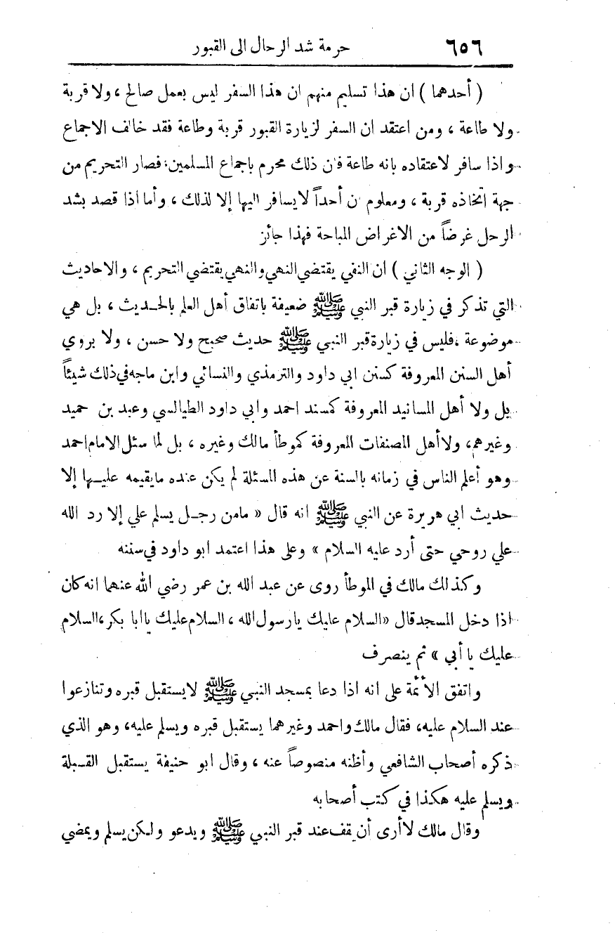 "الوجه الثاني": أن النفي يقتضي النهي، والنهي يقتضي التحريم، والأحاديث التي تذكر في زيارة قبر النبي صلى الله عليه وسلم ضعيفة باتفاق أهل العلم بالحديث، بل هي موضوعة، فليس في زيارة قبر النبي صلى الله عليه وسلم حديث صحيح ولا حسن، ولا يروي أهل السنن المعروفة كسنن أبي داود والترمذي والنسائي وابن ماجه في ذلك شيئا، بل ولا أهل المسانيد المعروفة كمسند أحمد وأبي داود الطيالسي وعبد بن حميد وغيرهم، ولا أهل المصنفات المعروفة كموطأ مالك وغيره، بل لمَّا سُئِلَ الإمام أحمد -وهو أعلم الناس في زمانه بالسنة- عن هذه المسألة لم يكن عنده ما يقيمه عليها إلا حديث أبي هريرة عن النبي صلى الله عليه وسلم أنه قال: "ما من رجل يُسَلِّمُ عليَّ إلا ردَّ الله علي روحي حتى أردَّ عليه السلام"1 وعلى هذا اعتمد أبو داود في سننه.
