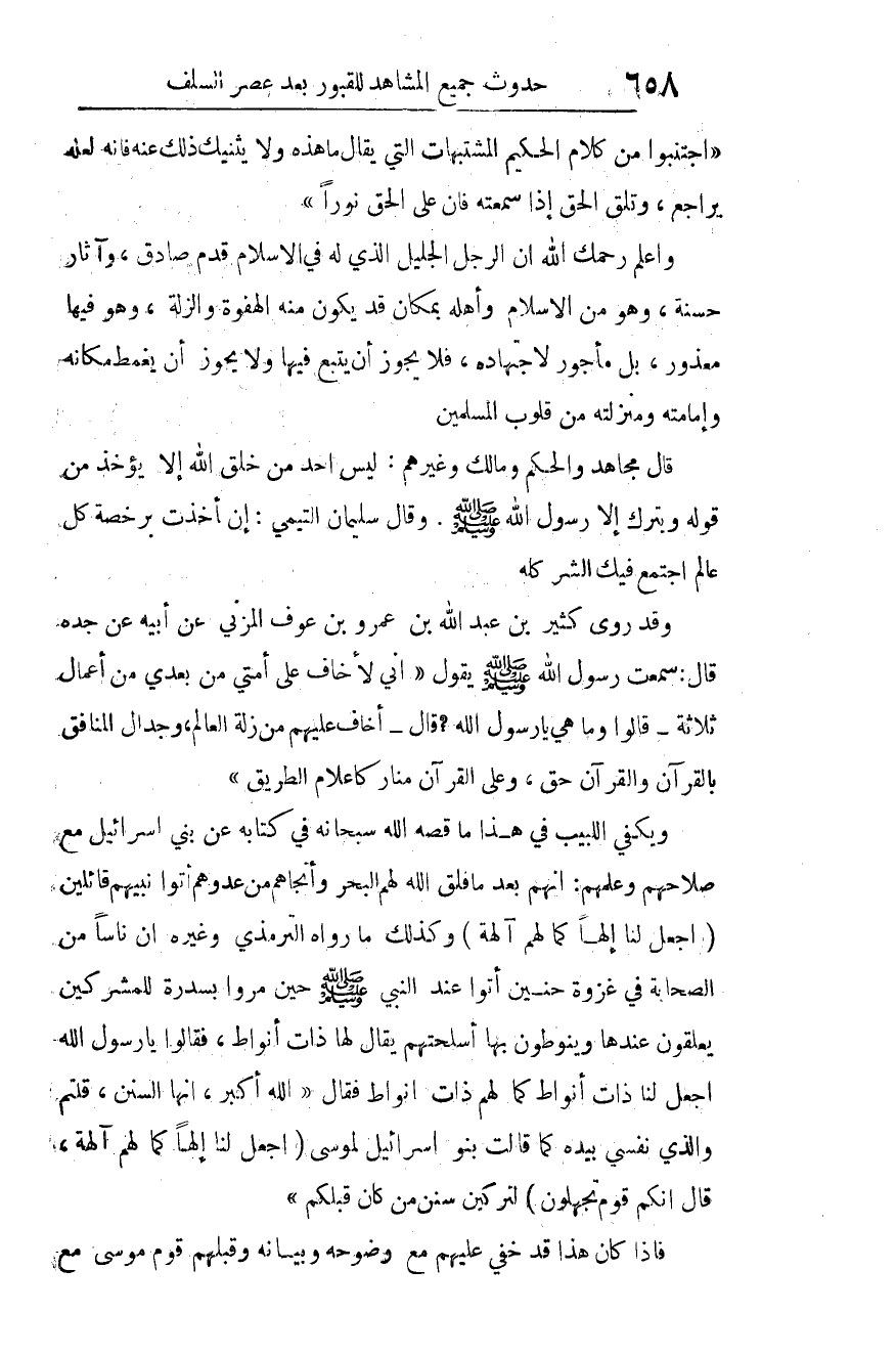 ويكفي اللبيب في هذا ما قصَّه الله -سبحانه- في كتابه عن بني إسرائيل مع صلاحهم وعلمهم: أنهم بعد ما فلق الله لهم البحر وأنجاهم من عدوهم أتوا نبيهم قائلين: {اجْعَلْ لَنَا إِلَهًا كَمَا لَهُمْ آلِهَةٌ} 1 وكذلك ما رواه الترمذي وغيره: "أن ناسا من الصحابة في غزوة حنين أتوا عند النبي صلى الله عليه وسلم حين مروا بسدرة للمشركين يعلقون عندها وينوطون بها أسلحتهم يقال لها: ذات أنواط، فقالوا: يا رسول الله: اجعل لنا ذات أنواط كما لهم ذات أنواط فقال: الله أكبر، إنها السنن، قلتم -والذي نفسي بيده- كما قالت بنو إسرائيل لموسى: {اجعل لنا إلها كما لهم آلهة قال إنكم قوم تجهلون} لتركبن سنن من كان قبلكم".