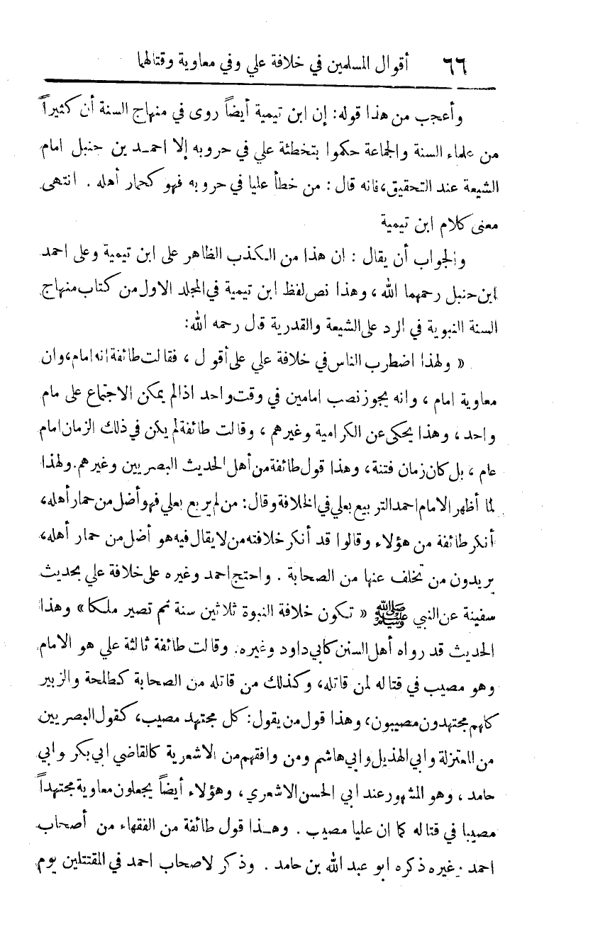 قال رحمه الله: "ولهذا اضطرب الناس في خلافة علي على أقوال، فقالت طائفة: إنه إمام، وأن معاوية إمام، وأنه يجوز نصب إمامين في وقت واحد إذا لم يمكن الاجتماع على إمام واحد، وهذا يحكى عن الكرامية وغيرهم، وقالت طائفة: لم يكن في ذلك الزمان إمام عام، بل كان زمان فتنة، وهذا قول طائفة من أهل الحديث البصريين وغيرهم.