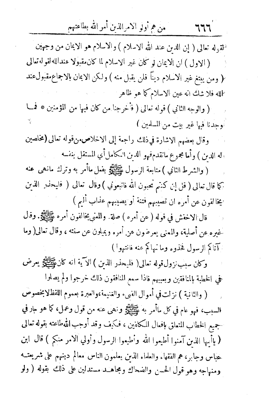 "والثانية": نزلت في أموال الفيء والغنيمة، والعبرة بعموم اللفظ لا بخصوص السبب، فهو عام في كل ما أمر به صلى الله عليه وسلم ونهى عنه من قول وعمل، كما هو جارٍ في جميع الخطاب المتعلق بأفعال المكلفين، فكيف وقد أوجب الله طاعته بقوله -تعالى-: {اأَيُّهَا الَّذِينَ آمَنُوا أَطِيعُوا اللَّهَ وَأَطِيعُوا الرَّسُولَ وَأُولِي الْأَمْرِ مِنْكُمْ} 9؟ قال ابن عباس وجابر: "هم الفقهاء والعلماء الذين يُعَلِّمُون الناس معالم دينهم على شريعته ومنهاجه"، وهو قول الحسن والضحاك ومجاهد مستدلين على ذلك بقوله: {وَلَوْ