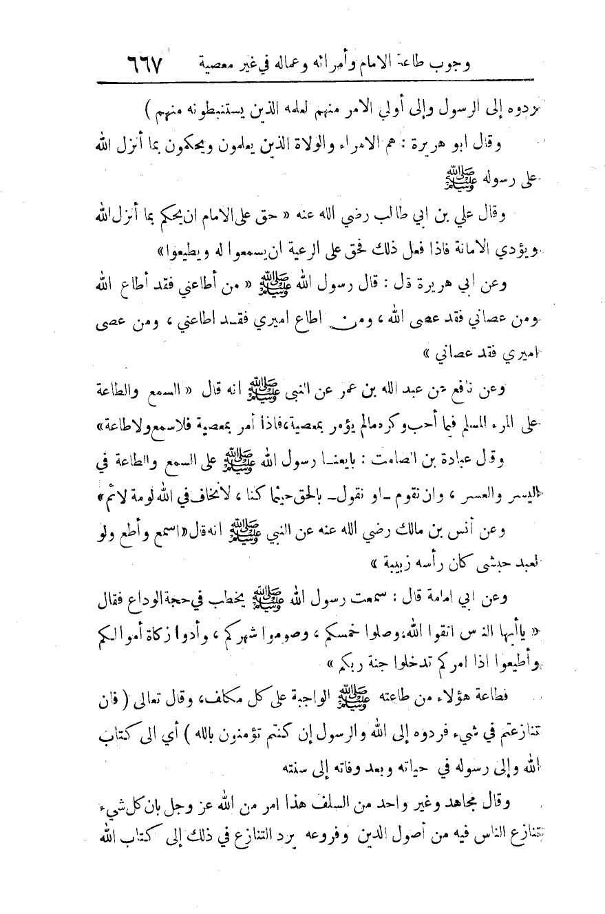 فطاعة هؤلاء من طاعته صلى الله عليه وسلم الواجبة على كل مكلف، وقال -تعالى-: {فَإِنْ تَنَازَعْتُمْ فِي شَيْءٍ فَرُدُّوهُ إِلَى اللَّهِ وَالرَّسُولِ إِنْ كُنْتُمْ تُؤْمِنُونَ بِاللَّهِ} 7 أي: إلى كتاب الله وإلى رسوله في حياته، وبعد وفاته إلى سنته.