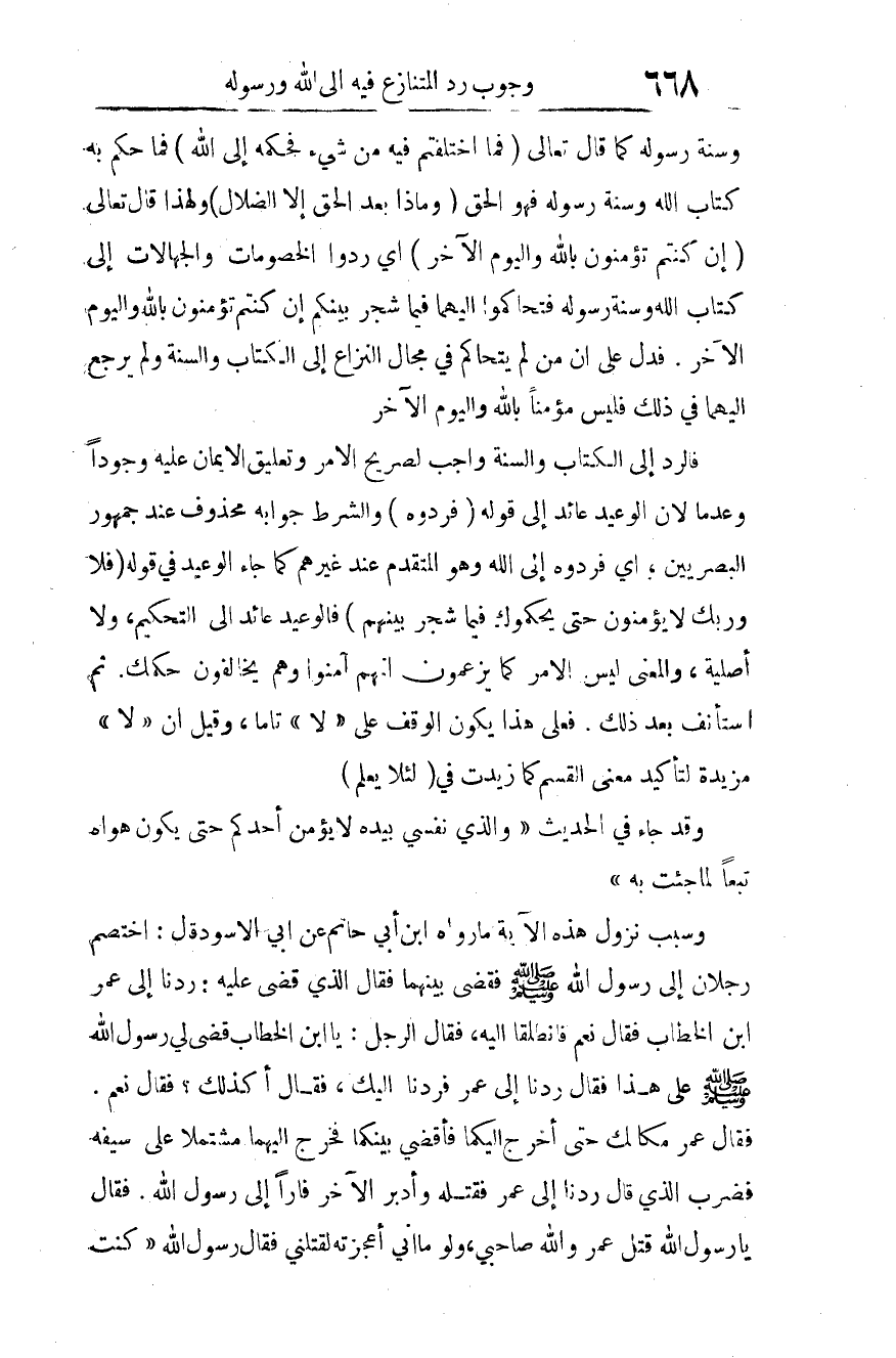 فالرد إلى الكتاب والسنة واجب لصريح الأمر، وتعليق الإيمان عليه وجودا وعدما؛ لأن الوعيد عائد إلى قوله: "فردوه" والشرط جوابه محذوف عند جمهور البصريين، أي: فردوه إلى الله وهو المتقدم عند غيرهم، كما جاء الوعيد في قوله: {لا وَرَبِّكَ لا يُؤْمِنُونَ حَتَّى يُحَكِّمُوكَ فِيمَا شَجَرَ بَيْنَهُمْ} 4 فالوعيد عائد إلى التحكيم، و"لا" أصلية، والمعنى: ليس الأمر كما يزعمون أنهم آمنوا وهم يخالفون حكمك، ثم استأنف بعد ذلك، فعلى هذا يكون الوقف على "لا" تاما، وقيل: إن "لا" مزيدة لتأكيد معنى القسم، كما زيدت في: {لئلا يعلم} 5.