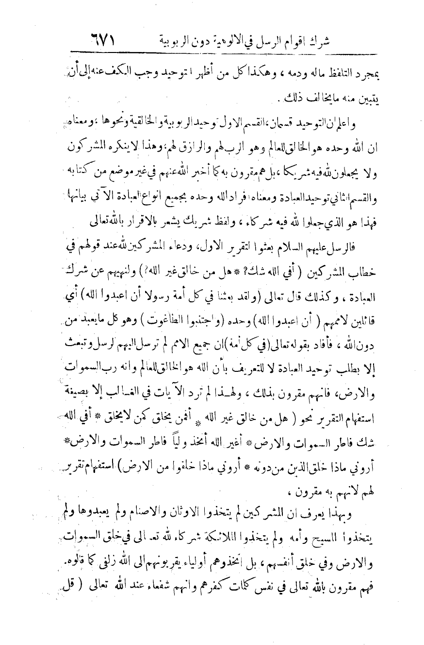 فالرسل -عليهم السلام- بُعِثُوا لتقرير الأول، ودعاء المشركين لله عند قولهم في خطاب المشركين: {أفِي اللَّهِ شَكٌّ} 1 {هَلْ مِنْ خَالِقٍ غَيْرُ اللَّهِ} 2 ولنهيهم عن شرك العبادة، وكذلك قال -تعالى-: {وَلَقَدْ بَعَثْنَا فِي كُلِّ أُمَّةٍ رَسُولًا أَنِ اعْبُدُوا اللَّهَ} 3 أي: قائلين لأممهم: {أَنِ اعْبُدُوا اللَّهَ} 4 وحده {وَاجْتَنِبُوا الطَّاغُوتَ} 5 وهو كل ما يعبد من دون الله، فأفاد بقوله -تعالى-: {فِي كُلِّ أُمَّةٍ} 6 أن جميع الأمم لم ترسل إليهم الرسل، وتبعث إلا بطلب توحيد العبادة لا للتعريف بأن الله هو الخالق للعالم، وأنه رب السماوات والأرض، فإنهم مقرون بذلك؛ ولهذا لم ترد الآيات في الغالب إلا بصيغة استفهام التقرير نحو: {هَلْ مِنْ خَالِقٍ غَيْرُ اللَّهِ} 7 {أَفَمَنْ يَخْلُقُ كَمَنْ لا يَخْلُقُ} 8 {أَفِي اللَّهِ شَكٌّ فَاطِرِ السَّمَاوَاتِ وَالْأَرْضِ} 9 {قُلْ أَغَيْرَ اللَّهِ أَتَّخِذُ وَلِيًّا فَاطِرِ السَّمَاوَاتِ وَالْأَرْضِ} 10 {فَأَرُونِي مَاذَا خَلَقَ الَّذِينَ مِنْ دُونِهِ} 11 {أَرُونِي مَاذَا خَلَقُوا مِنَ الْأَرْضِ} 12 استفهام تقرير لهم؛ لأنهم به مقرون.