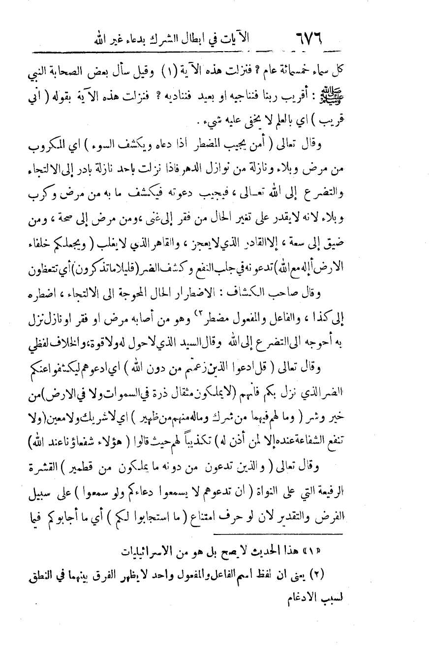 وقال صاحب الكشاف: "الاضطرار الحال المحوجة إلى الالتجاء، اضطره إلى كذا، والفاعل والمفعول مضطر 6 وهو من أصابه مرض أو فقر أو نازل نزل به أحوجه إلى التضرع إلى الله"، وقال السيد: "الذي لا حول له ولا قوة"، والخلاف لفظي.