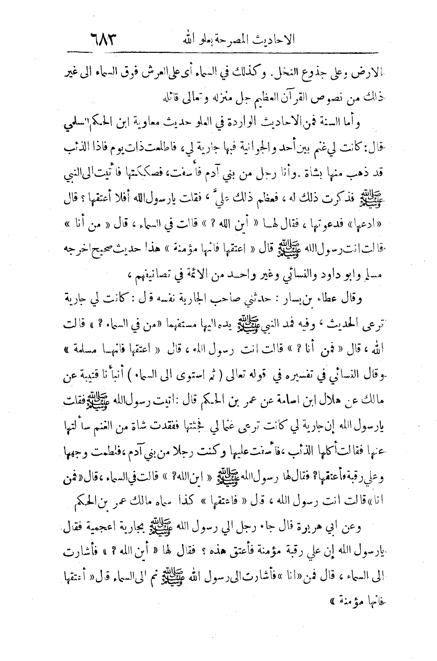 وأما السنة: فمن الأحاديث الواردة في العلو حديث معاوية بن الحكم السلمي قال: "كانت لي غنم بين أحد والجوانية فيها جارية لي، فاطلعت ذات يوم، فإذا الذئب قد ذهب منها بشاة، وأنا رجل من بني آدم فأسفت، فصككتها، فأتيت إلى النبي صلى الله عليه وسلم فذكرت ذلك له، فعظم ذلك علي، فقلت: يا رسول الله: أفلا أعتقها؟ قال: ادعها. فدعوتها، فقال لها: أين الله؟ قالت: في السماء قال: مَنْ أنا؟ قالت: أنت رسول الله صلى الله عليه وسلم قال: أعتقها فإنها مؤمنة"1 هذا حديث صحيح، أخرجه مسلم وأبو داود والنسائي، وغير واحد من الأئمة في تصانيفهم.