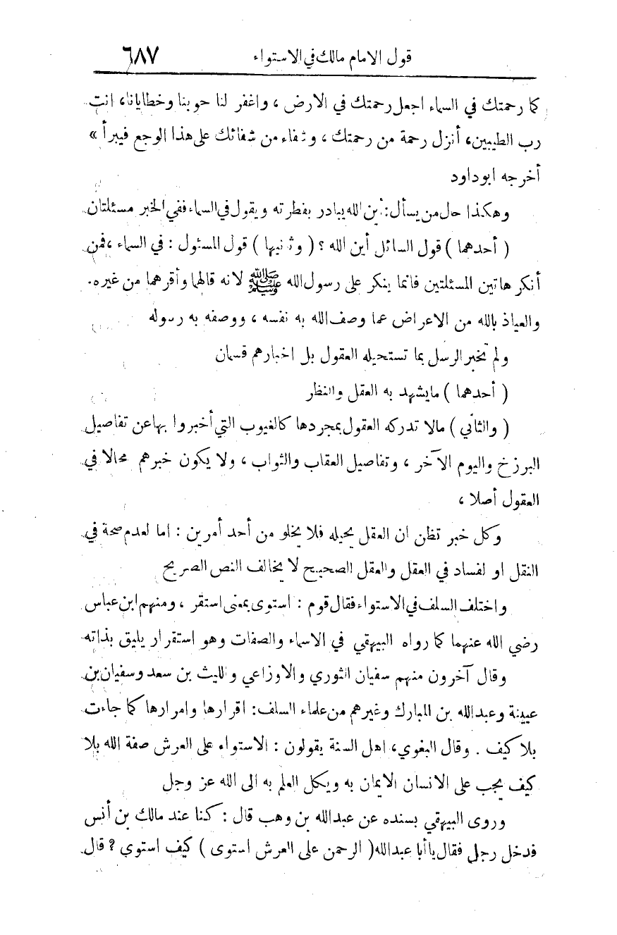 وروى البيهقي بسنده عن عبد الله بن وهب قال: كنا عند مالك بن أنس، فدخل رجل، فقال: يا أبا عبد الله: {الرحمن عفلى العرش استوى} 2 كيف استوى؟ قال: