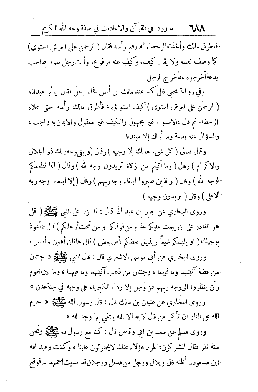 وقال -تعالى-: {كُلُّ شَيْءٍ هَالِكٌ إِلَّا وَجْهَهُ} 3 وقال: {وَيَبْقَى وَجْهُ رَبِّكَ ذُو الْجَلالِ وَالْأِكْرَامِ} 4 وقال: {وَمَا آتَيْتُمْ مِنْ زَكَاةٍ تُرِيدُونَ وَجْهَ اللَّهِ} وقال: {نَّمَا نُطْعِمُكُمْ لِوَجْهِ اللَّهِ} 5 وقال: {وَالَّذِينَ صَبَرُوا ابْتِغَاءَ وَجْهِ رَبِّهِمْ} 6 وقال: {إِلا ابْتِغَاءَ وَجْهِ رَبِّهِ الْأَعْلَى} 7 وقال: {يُرِيدُونَ وَجْهَه} 8.