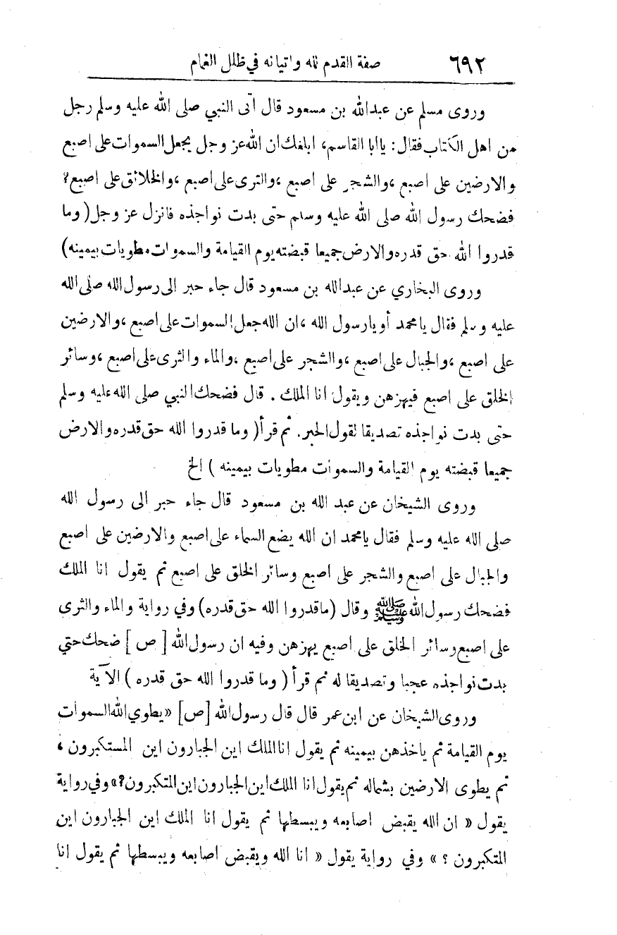 وروى مسلم عن عبد الله بن مسعود قال: "أتى النبي صلى الله عليه وسلم رجل من أهل الكتاب، فقال: يا أبا القاسم: أَبَلَغَكَ أن الله عز وجل يجعل السماوات على أصبع، والأرضين على أصبع، والشجر على أصبع، والثرى على أصبع، والخلائق على أصبع؟ فضحك رسول الله صلى الله عليه وسلم حتى بدت نواجذه، فأنزل عز وجل {وما قدروا الله حق قدره والأرض جميعا قبضته يوم القيامة والسماوات مطويات بيمينه} "1.