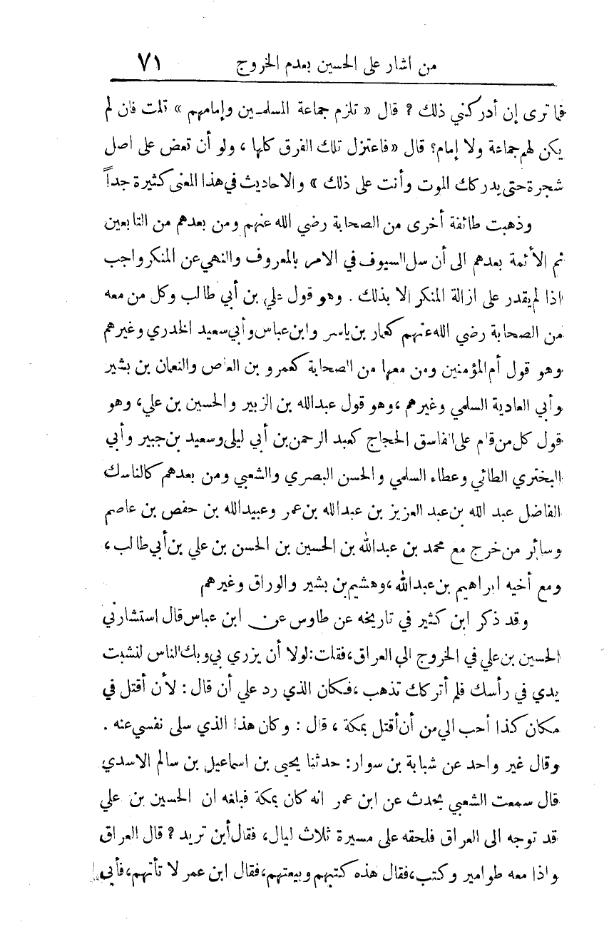وقد ذكر ابن كثير في تاريخه عن طاوس، عن ابن عباس قال: استشارني الحسين بن علي في الخروج إلى العراق، فقلت: لولا أن يزري بي وبك الناس لنشبت يدي في رأسك، فلم أتركك تذهب، فكان الذي رد علي أن قال: لأن أُقتل في مكان كذا أحب إلي من أن أقتل بمكة، قال: وكان هذا الذي سلى نفسي عنه.
