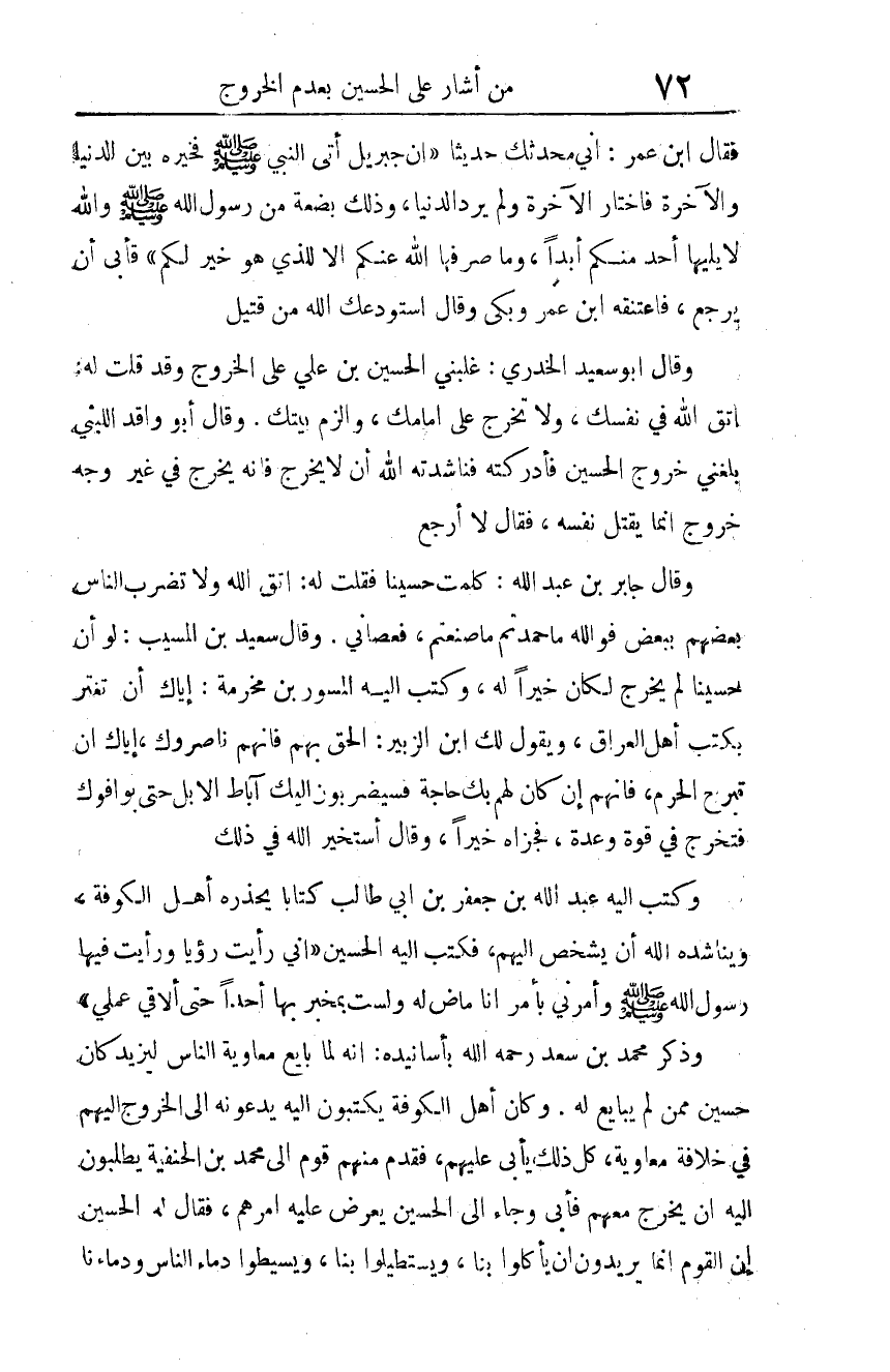 وقال جابر بن عبد الله: كلمت حسينا فقلت له: اتق الله، ولا تضرب الناس بعضهم ببعض، فوالله ما حمدتم ما صنعتم، فعصاني. وقال سعيد بن المسيب: لو أن حسينا لم يخرج لكان خيرا له، وكتب إليه المسور بن مخرمة: إياك أن تغتر بكتب أهل العراق، ويقول لك ابن الزبير: ألحق بهم فإنهم ناصروك، إياك أن تبرح الحرم، فإنهم إن كان لهم بك حاجة، فسيضربون إليك آباط الإبل حتى يوافوك، فتخرج في قوة وعدة، فجزاه خيرا، وقال: أستخير الله في ذلك.