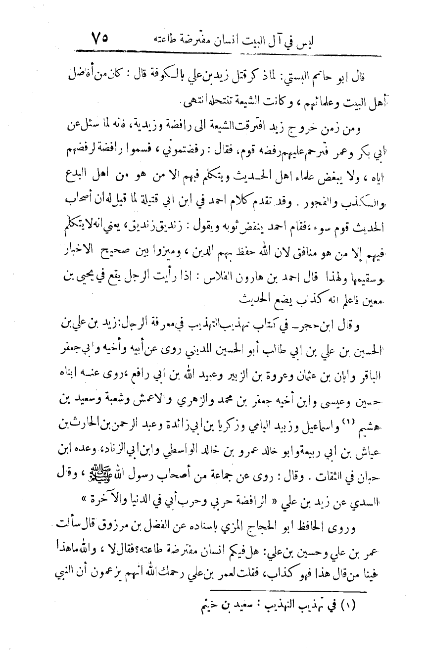 قال أبو حاتم البستي: لما ذكر قتل زيد بن علي بالكوفة قال: كان من أفاضل أهل البيت وعلمائهم، وكانت الشيعة تنتحله. انتهى.