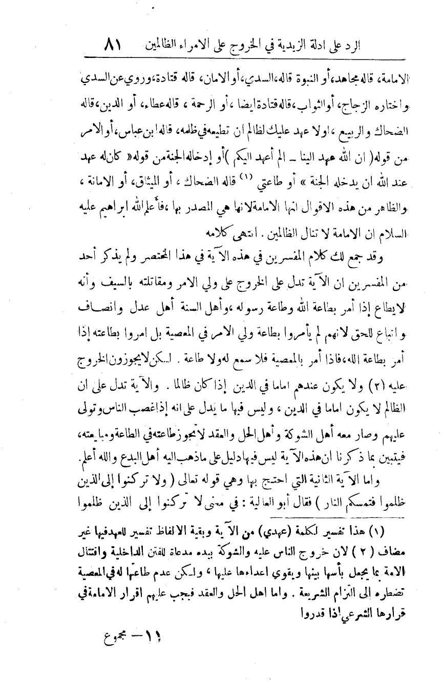 وقد جمع لك كلام المفسرين في هذه الآية في هذا المختصر، ولم يذكر أحد من المفسرين أن الآية تدل على الخروج على ولي الأمر ومقاتلته بالسيف، وأنه لا يطاع إذا أمر بطاعة الله وطاعة رسوله. وأهل السنة أهل عدل وإنصاف واتباع للحق؛ لأنهم لم يأمروا بطاعة ولي الأمر في المعصية، بل أمروا بطاعته إذا أمر بطاعة الله، فإذا أمر بالمعصية، فلا سمع له ولا طاعة. لكن لا يجوزون الخروج عليه 4 ولا يكون عندهم إماما في الدين إذا كان ظالما.