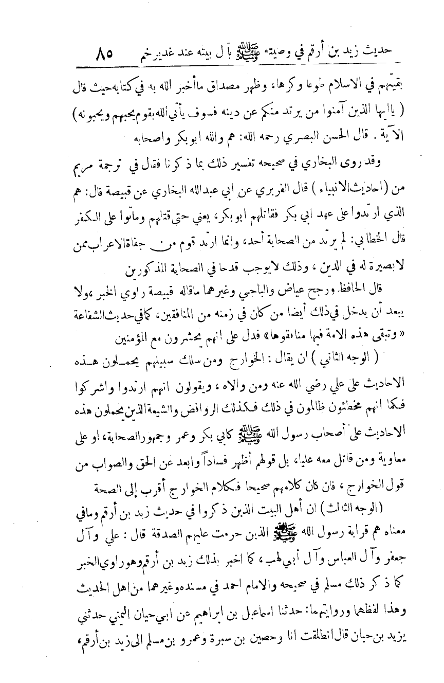 (الوجه الثالث): أن أهل البيت الذين ذكروا في حديث زيد بن أرقم، وما في معناه هم قرابة رسول الله صلى الله عليه وسلم الذين حرمت عليهم الصدقة، قال: علي، وآل جعفر، وآل العباس، وآل أبي لهب، كما أخبر بذلك زيد بن أرقم، وهو راوي الخبر، كما ذكر ذلك مسلم في صحيحه، والإمام أحمد في مسنده، وغيرهما من أهل الحديث، وهذا لفظهما، وروايتهما: حدثنا إسماعيل بن إبراهيم عن أبي حيان اليمني، حدثني يزيد بن حبان، قال: انطلقت أنا وحصين بن سبرة، وعمرو بن مسلم إلى زيد بن أرقم،