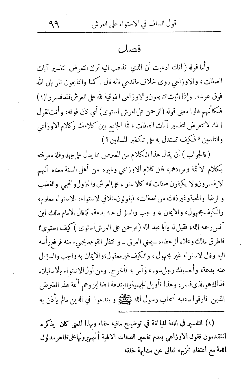 (فالجواب) أن يقال: هذا الكلام من المعترض مما يدل على جهله، وقلة معرفته بكلام الأئمة ومرادهم، فإن كلام الأوزاعي وغيره من أهل السنة معناه: أنهم لا يفسرون، ولا يكيفون صفات الله كالاستواء على العرش، والنُزول، والمجيء، والغضب، والرضى، والمحبة وغير ذلك من الصفات. فيقولون مثلا في الاستواء: الاستواء معلوم، والكيف مجهول، والإيمان به واجب، والسؤال عنه بدعة، كما قال الإمام مالك ابن أنس رحمه الله، فقيل له: يا أبا عبد الله {الرَّحْمَنُ عَلَى الْعَرْشِ اسْتَوَى} 3، كيف استوى؟ فأطرق مالك، وعلاه الرحضاء -يعني العرق-، وانتظر القوم ما يجيء منه، فرفع رأسه إليه، وقال: الاستواء غير مجهول، والكيف غير معقول، والإيمان به واجب، والسؤال عنه بدعة، وأحسبك رجل سوء، وأمر به فأخرج.