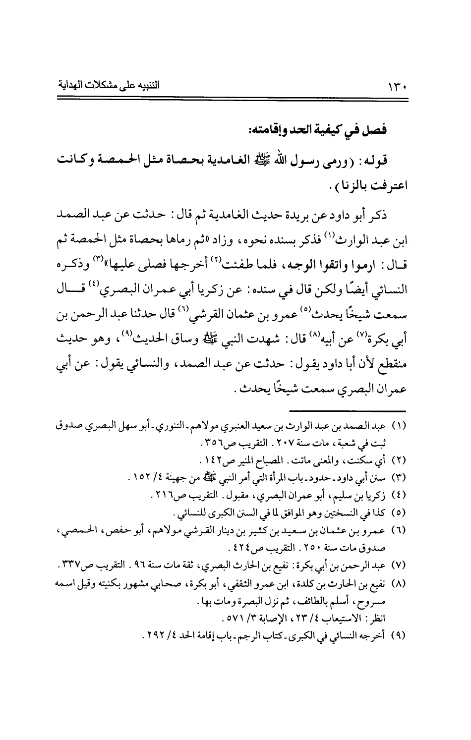 ذكر أبو داود عن بريدة حديث الغامدية ثم قال: حدثت عن عبد الصمد ابن عبد الوارث فذكر بسنده نحوه، وزاد (ثم رماها بحصاة مثل الحمصة ثم قال: ارموا واتقوا الوجه، فلما طفئت أخرجها فصلى عليها" وذكره النسائي أيضًا ولكن قال في سنده: عن زكريا أبي عمران البصري قال سمعت شيخًا يحدث عمرو بن عثمان القرشي قال حدثنا عبد الرحمن بن أبي بكرة عن أبيه قال: شهدت النبي -صلى الله عليه وسلم -وساق الحديث، وهو حديث منقطع لأن أبا داود يقول: حدثت عن عبد الصمد، والنسائي يقول: عن أبي عمران البصري سمعت شيخًا يحدث.
