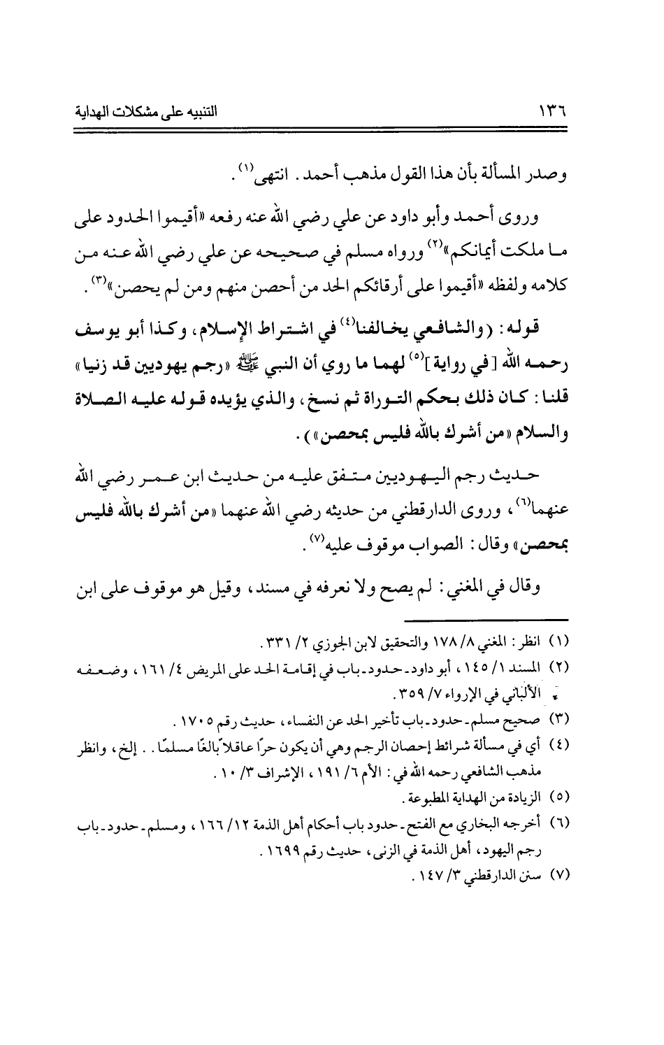 حديث رجم اليهوديين متفق عليه من حديث ابن عمر -رضي الله عنهما -، وروى الدارقطني من حديثه -رضي الله عنهما -"من أشرك بالله فليس بمحصن" وقال: الصواب موقوف عليه.