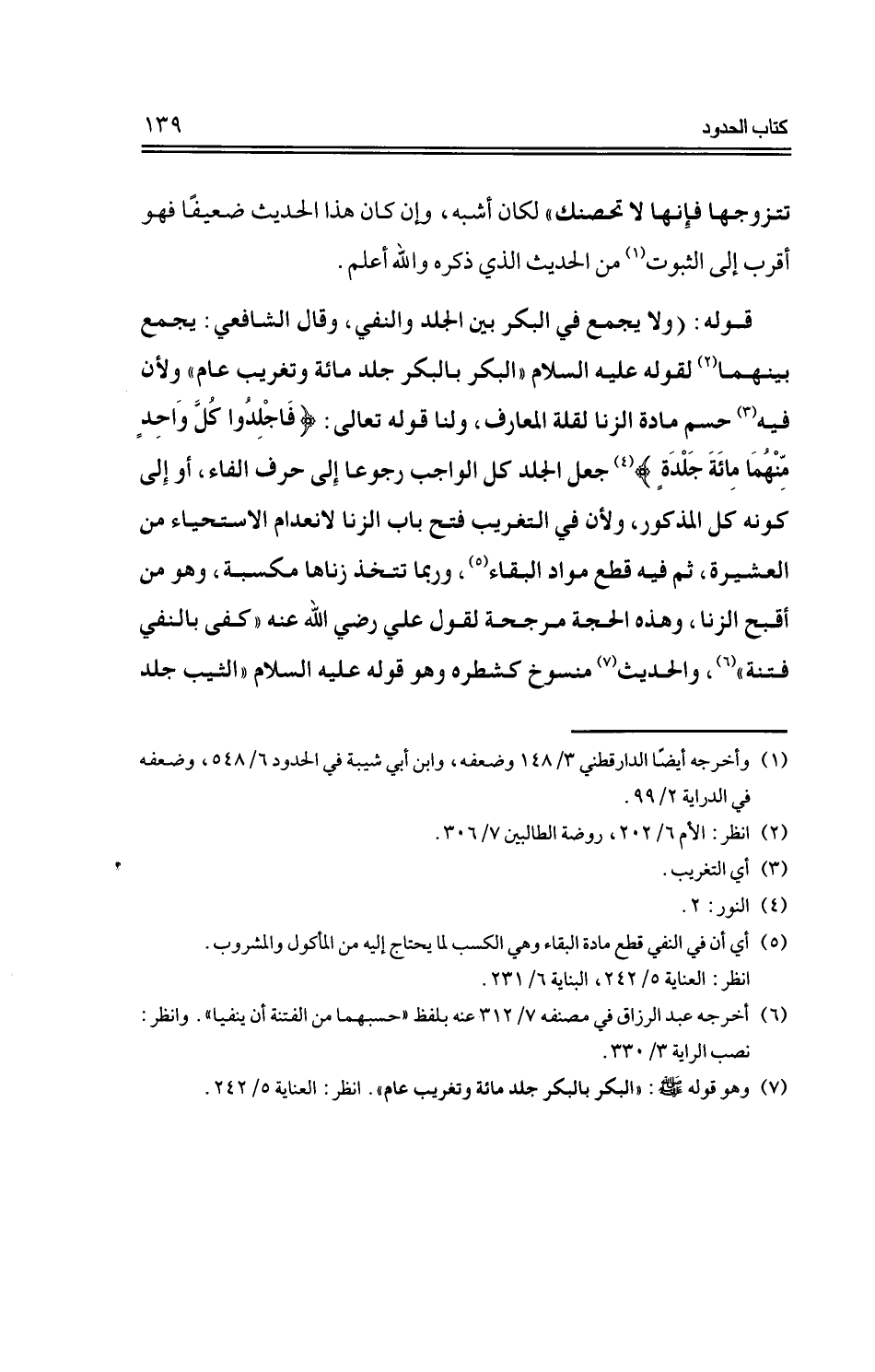 قوله: (ولا يجمع في البكر بين الجلد والنفي، وقال الشافعي: يجمع بينهما لقوله -عليه السلام -"البكر بالبكر جلد مائة وتغريب عام" ولأن فيه حسم مادة الزنا لقلة المعارف، ولنا قوله تعالى: {فاجلدوا كل واحدٍ منهما مائة جلدة} جعل الجلد كل الواجب رجوعا إلى حرف الفاء، أو إلى كونه كل المذكور، ولأن في التغريب فتح باب الزنا لانعدام الاستحياء من العشيرة، ثم فيه قطع مواد البقاء، وربما تتخذ زناها مكسبة، وهو من أقبح الزنا، وهذه الحجة مرجحة لقول علي -رضي الله عنه -"كفى بالنفي فتنة"، والحديث منسوخ كشطره وهو قوله -عليه السلام -"الثيب جلد