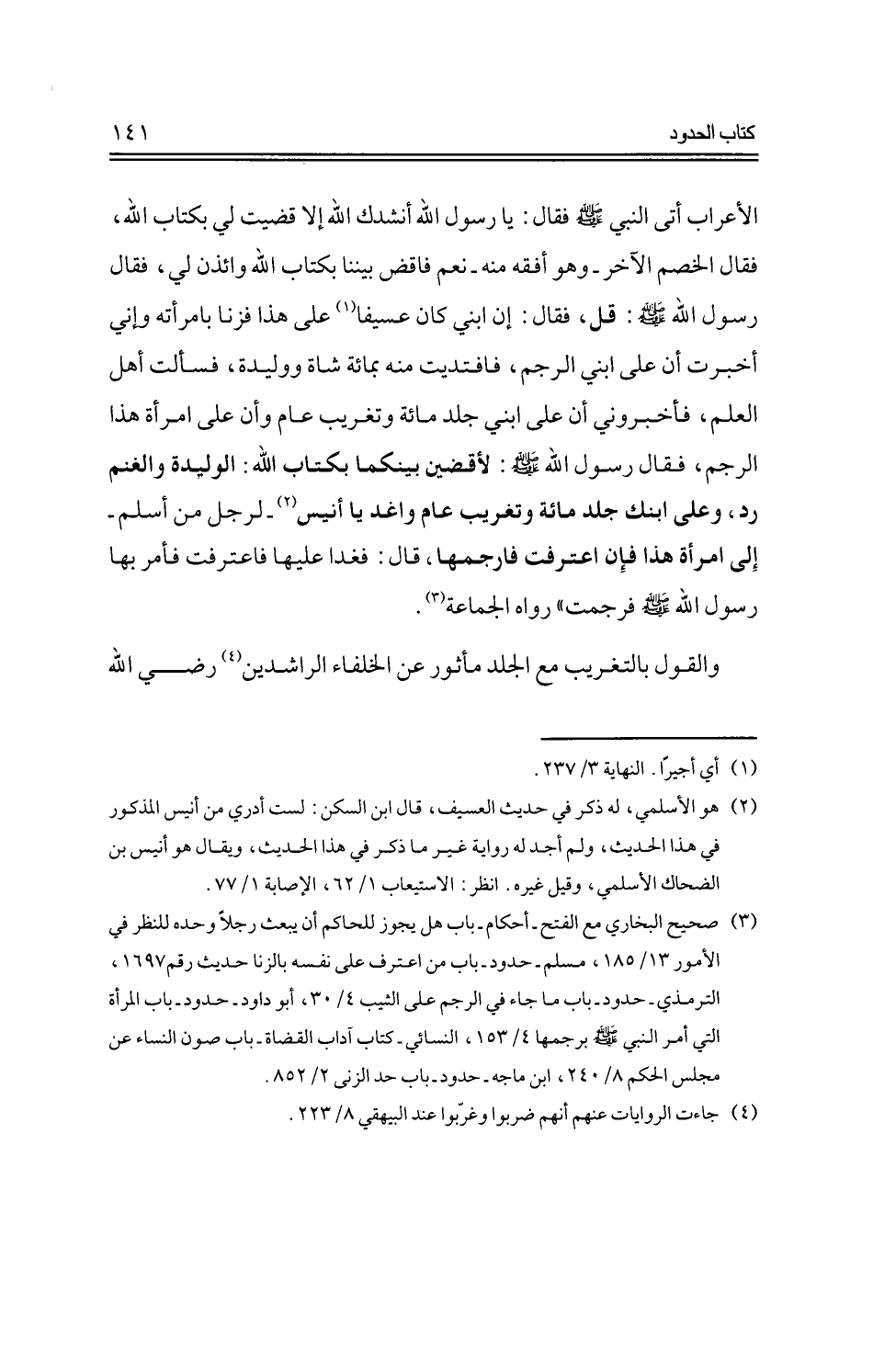 الأعراب أتى النبي -صلى الله عليه وسلم -فقال: يا رسول الله أنشدك الله إلا قضيت لي بكتاب الله، فقال الخصم الآخر -وهو أفقه منه -نعم فاقض بيننا بكتاب الله وائذن لي، فقال رسول الله -صلى الله عليه وسلم -: قل، فقال: إن ابني كان عسيفا على هذا فزنا بامرأته وإني أخبرت أن على ابني الرجم، فافتديت منه بمائة شاة ووليدة، فسألت أهل العلم، فأخبروني أن على ابني جلد مائة وتغريب عام وأن على امرأة هذا الرجم، فقال رسول الله -صلى الله عليه وسلم -: لأقضين بينكما بكتاب الله: الوليدة والغنم رد، وعلى ابنك جلد مائة وتغريب عام واغد يا أنيس -لرجل من أسلم -إلى امرأة هذا فإن اعترفت فارجمها، قال: فغدا عليها فاعترفت فأمر بها رسول الله -صلى الله عليه وسلم -فرجمت" رواه الجماعة.