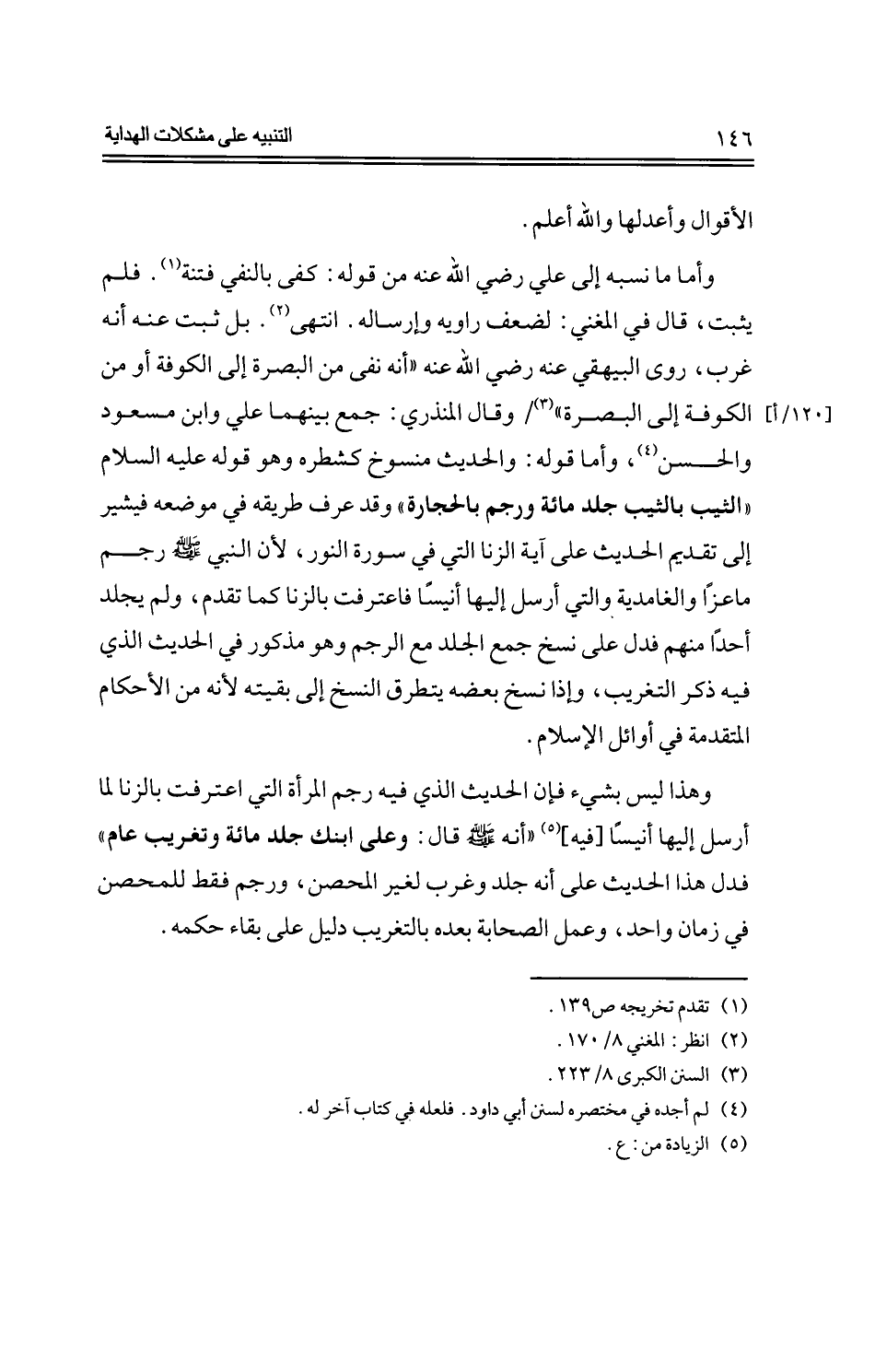 وأما ما نسبه إلى علي -رضي الله عنه -من قوله: كفى بالنفي فتنة. فلم يثبت، قال في المغني: لضعف راويه وإرساله. انتهى. بل ثبت عنه أنه غرب، روى البيهقي عنه رضي الله عنه "أنه نفى من البصرة إلى الكوفة أو من الكوفة إلى البصرة"/ وقال المنذري: جمع بينهما علي وابن مسعود والحسن، وأما قوله: والحديث منسوخ كشطره وهو قوله -عليه السلام -"الثيب بالثيب جلد مائة ورجم بالحجارة" وقد عرف طريقه في موضعه فيشير إلى تقديم الحديث على آية الزنا التي في سورة النور، لأن النبي -صلى الله عليه وسلم -رجم ماعزًا والغامدية والتي أرسل إليها أنيسًا فاعترفت بالزنا كما تقدم، ولم يجلد أحدًا منهم فدل على نسخ جمع الجلد مع الرجم وهو مذكور في الحديث الذي فيه ذكر التغريب، وإذا نسخ بعضه يتطرق النسخ بعضه يتطرق النسخ إلى بقيته لأنه من الأحكام المتقدمة في أوائل الإسلام.