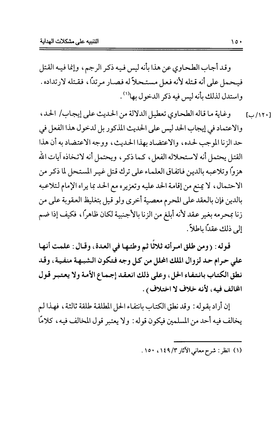 وقد أجاب الطحاوي عن هذا بأنه ليس فيه ذكر الرجم، وإنما فيه القتل فيحمل على أنه قتله لأنه فعل مستحلاً له فصار مرتدًا، فقتله لارتداده واستدل لذلك بأنه ليس فيه ذكر الدخول بها.