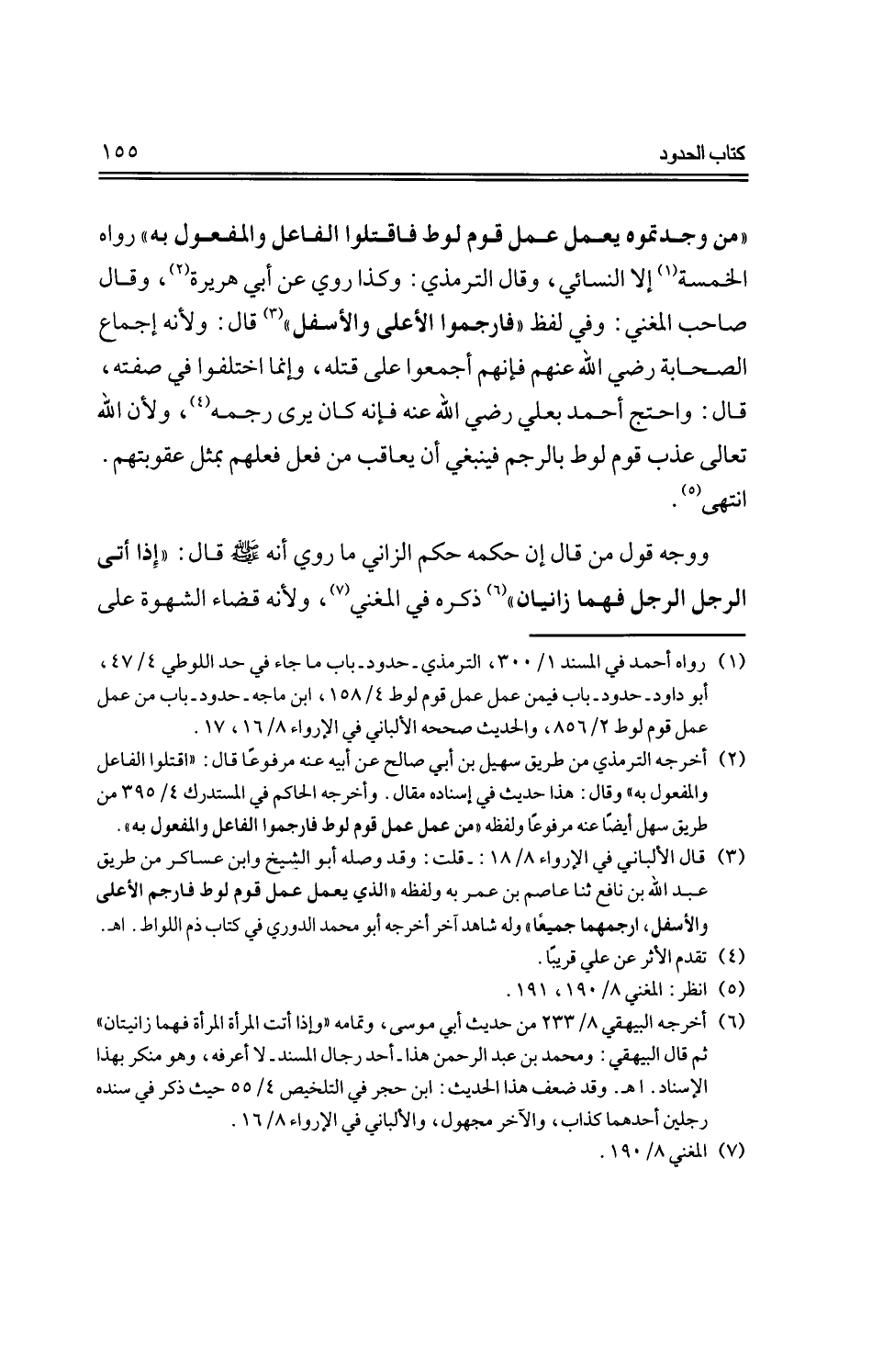 "من وجدتموه يعمل عمل قوم لوط فاقتلوا الفاعل والمفعول به" رواه الخمسة إلا النسائي، وقال الترمذي: وكذا روي عن أبي هريرة، وقال صاحب المغني: وفي لفظ "فارجموا الأعلى والأسفل" قال: ولأنه إجماع الصحابة -رضي الله عنهم -فإنهم أجمعوا على قتله، وإنما اختلفوا في صفته، قال: واحتج أحمد بعلي -رضي الله عنه -فإنه كان يرى رجمه، ولأن الله تعالى عذب قوم لوط بالرجم فينبغي أن يعاقب من فعل فعلهم بمثل عقوبتهم. انتهى.