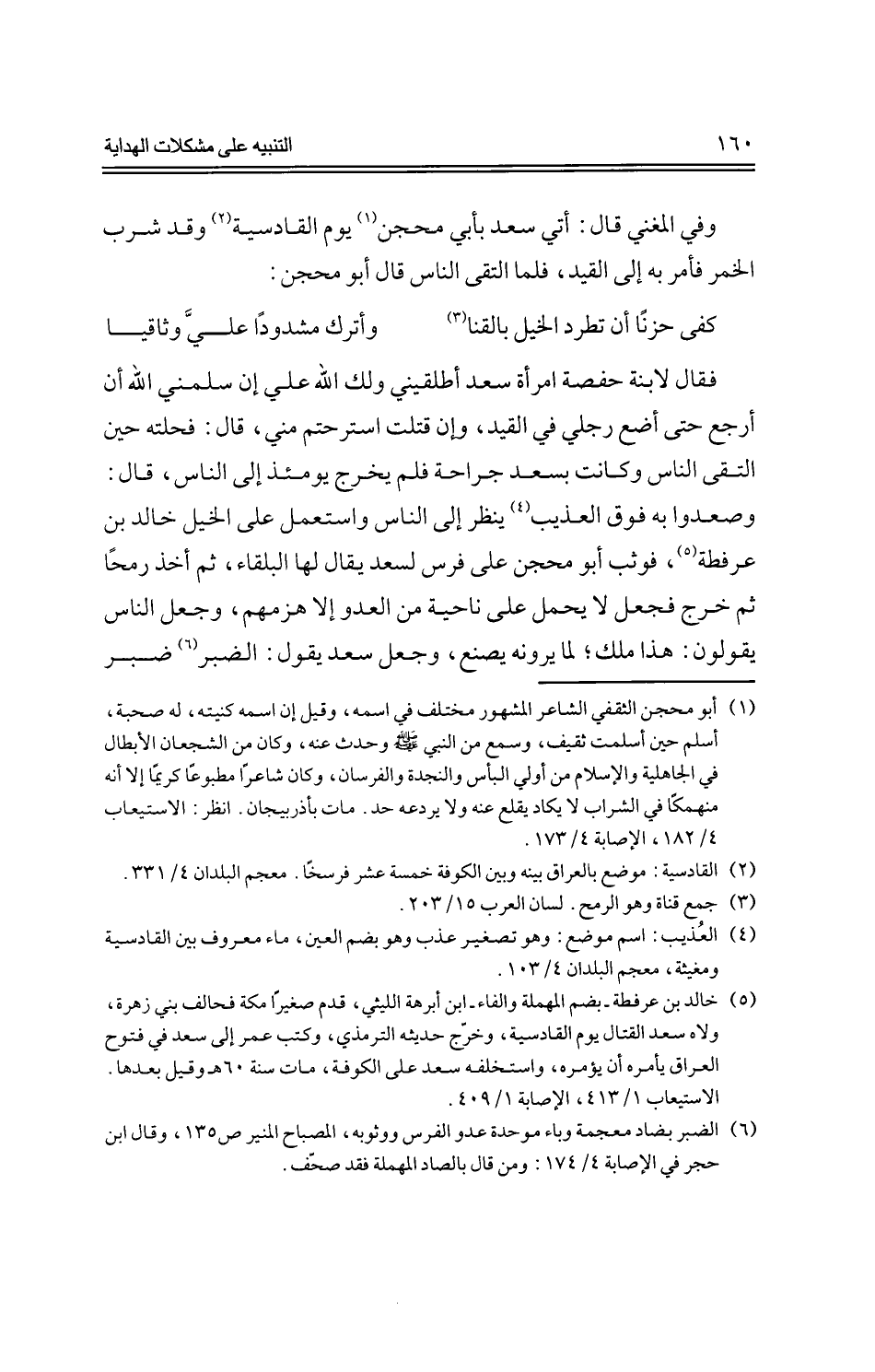 وفي المغني قال: أتي سعد بأبي محجن يوم القادسية وقد شرب الخمر فأمر به إلى القيد، فلما التقى الناس قال أبو محجن: