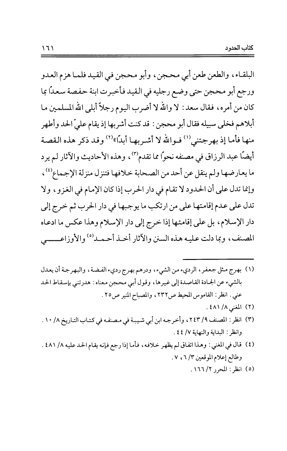 البلقاء، والطعن طعن أبي محجن، وأبو محجن في القيد فلما هزم العدو ورجع أبو محجن حتى وضع رجليه في القيد فأخبرت ابنة حفصة سعدًا بما كان أمره، فقال سعد: لا والله لا أضرب اليوم رجلاً أبلى الله المسلمين ما أبلاهم فخلى سبيله فقال أبو محجن: قد كنت أشربها إذ يقام علي الحد وأطهر منها فأمما إذ بهر جتني فوالله لا أِربها أبدًا" وقد ذكر هذه القصة أيضًا عبد الرزاق في مصنفه نحوًا مما تقدم، وهذه الأحاديث والآثار لم يرد ما يعارضها ولم ينقل عن أحد من الصحابة خلافها فتنزل منزلة الإجماع، وإنما تدل على أن الحدود لا تقام في دار الحرب إذا كان الإمام في الغزو، ولا تدل على عدم إقامتها على من ارتكب ما يوجبها في دار الحرب ثم خرج إلى دار الإسلام، بل على إقامتها إذا خرج إلى دار الإسلام وهذا عكس ما ادعاه المصنف، وبما دلت عليه هذه السنن والآثار أخذ أحمد والأوزاعي
