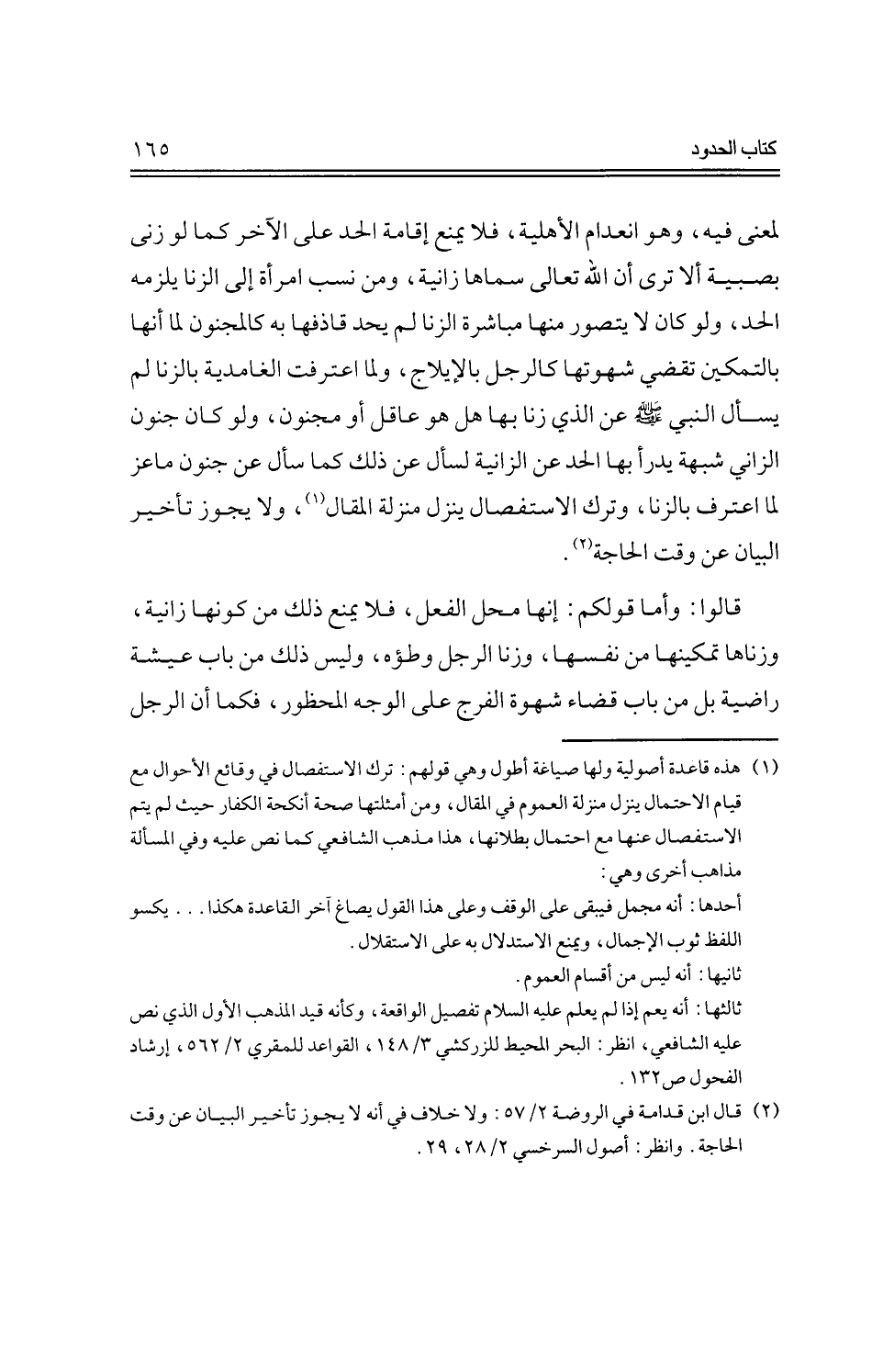 لمعنى فيه، وهو انعدام الأهلية، فلا يمنع إقامة الحد على الآخر كما لو زنى بصبية ألا ترى أن الله تعالى سماها زانية، ومن نسب امرأة إلى الزنا يلزمه الحد، ولو كان لا يتصور منها مباشرة الزنا لم يحد قاذفها به كالمجنون لما أنها بالتمكين تقضي شهوتها كالرجل بالإيلاج، ولما اعترفت الغامدية بالزنا لم يسأل النبي -صلى الله عليه وسلم -عن الذي زنا بها هل هو عاقل أو مجنون، ولو كان جنون الزاني شبهة يدرأ بها الحد عن الزانية لسأل عن ذلك كما سأل عن جنون ماعز لما اعترف بالزنا، وترك الاستفصال ينزل منزلة المقال، ولا يجوز تأخير البيان عن وقت الحاجة.