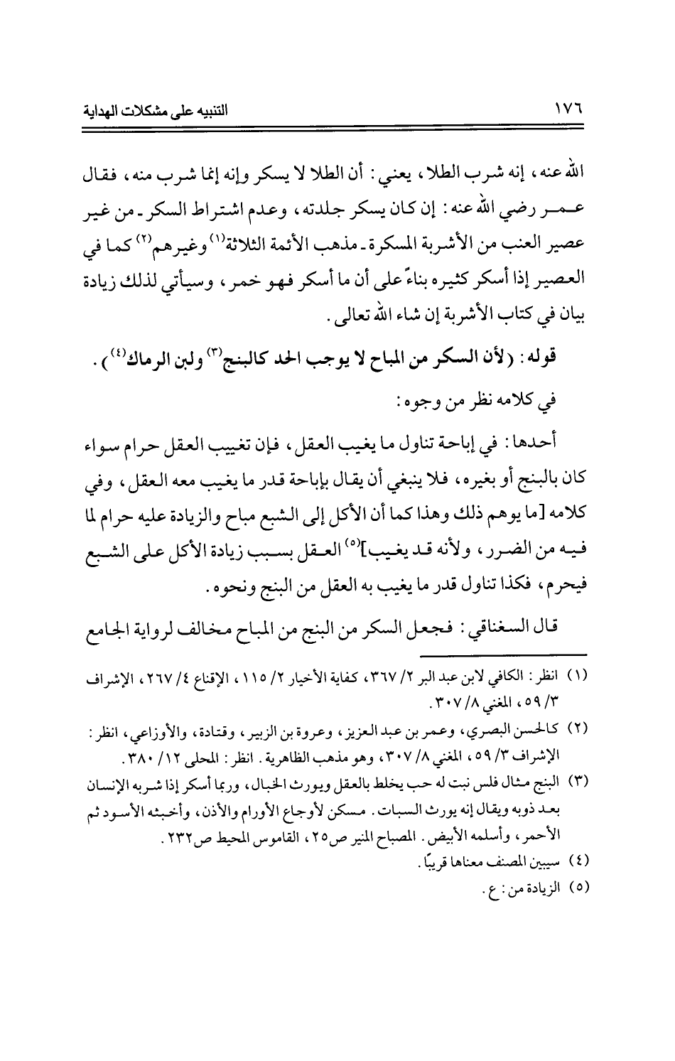 الله عنه -، إنه شرب الطلا، يعني: أن الطلا لا يسكر وإنه إنما شرب منه، فقال عمر -رضي الله عنه -: إن كان يسكر جلدته، وعدم اشتراط السكر -من غير عصير العنب من الأشربة المسكرة -مذهب الأئمة الثلاثة وغيرهم كما في العصير إذا أسكر كثيره بناءً على أن ما أسكر فهو خمر، وسيأتي لذلك زيادة بيان في كتاب الأشربة -إن شاء الله تعالى -.