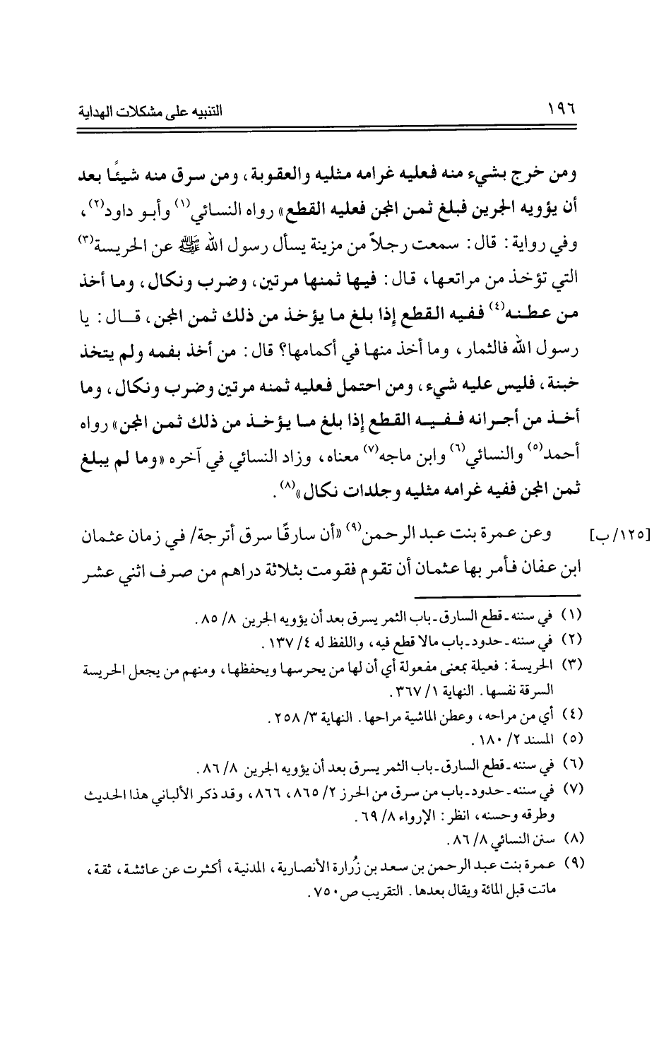 وعن عمرة بنت عبد الرحمن "أن سارقًا سرق أترجة/ في زمان عثمان ابن عفان فأمر بها عثمان أن تقوم فقومت بثلاثة دراهم من صرف اثني عشر