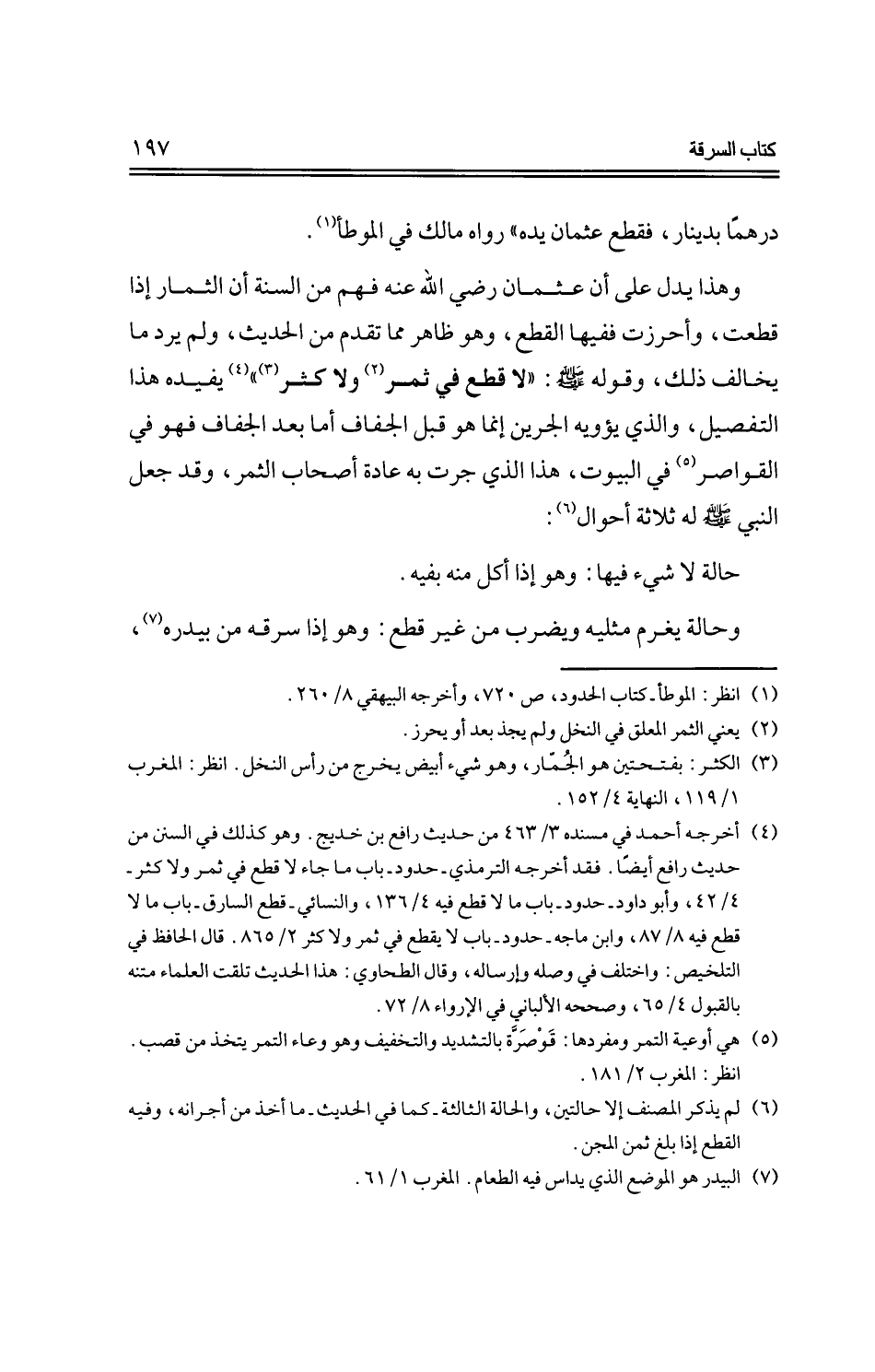 وهذا يدل على أن عثمان -رضي الله عنه -فهم من السنة أن الثمار إذا قطعت، وأحرزت ففيها القطع، وهو ظاهر مما تقدم من الحديث، ولم يرد ما يخالف ذلك، وقوله -صلى الله عليه وسلم -: "لا قطع في ثمر ولا كثر" يفيده هذا التفصيل، والذي يؤويه الجرين إنما هو قبل الجفاف أما بعد الجفاف فهو في القواصر في البيوت، هذا الذي جرت به عادة أصحاب الثمر، وقد جعل النبي -صلى الله عليه وسلم -له ثلاثة أحوال: