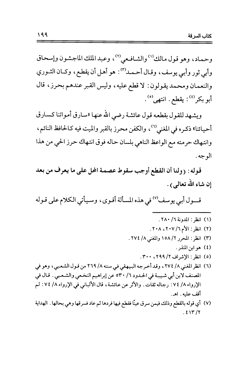 ويشهد للقول بقطعه قول عائشة -رضي الله عنها -"سارق أمواتنا كسارق أحيائنا" ذكره في المغني، والكفن محرز بالقبر والميت فيه كالحافظ النائم، وانتهاك حرمته مع الواعظ الناهي بلسان حاله فوق انتهاك حرز الحي من هذا الوجه.