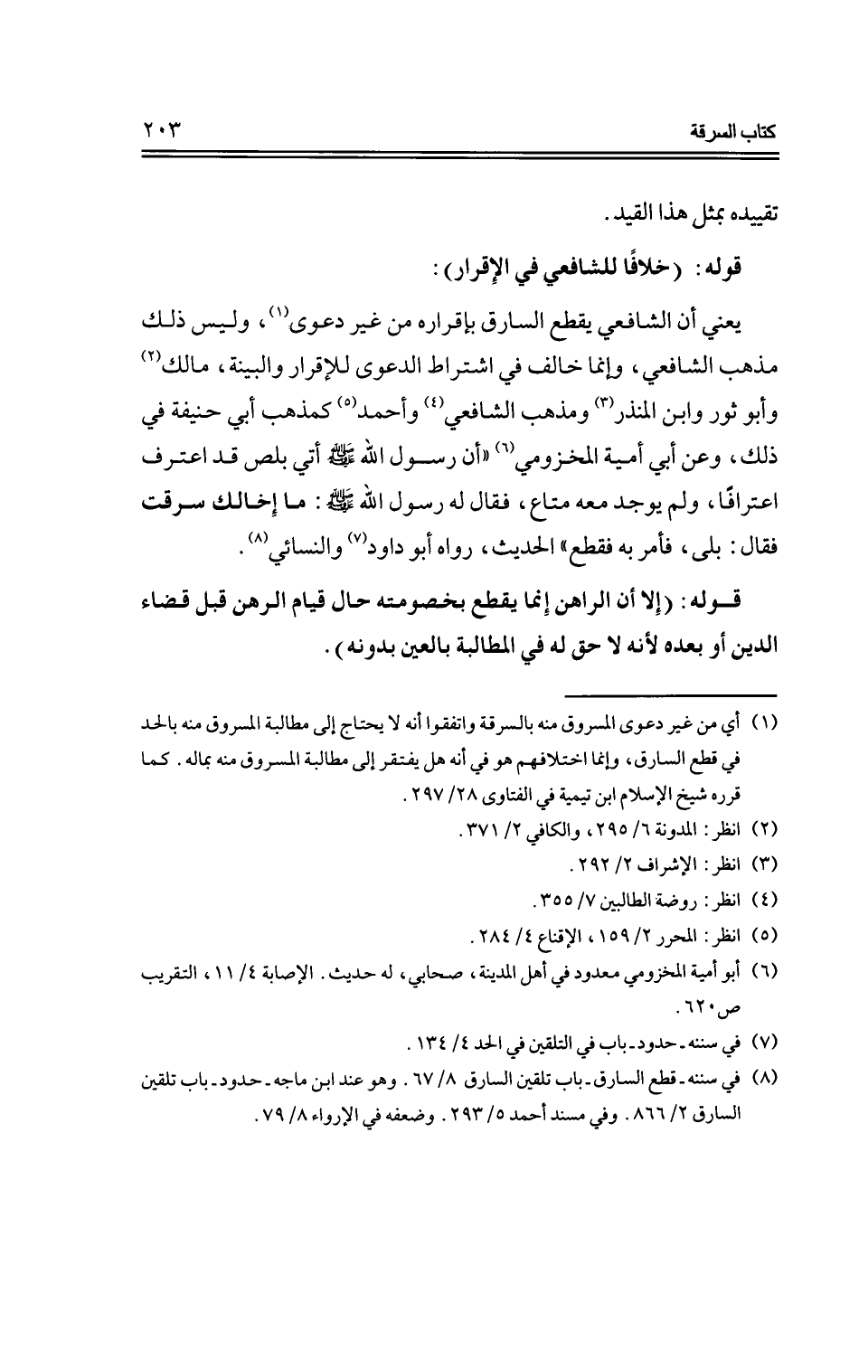 يعني أن الشافعي يقطع السارق بإقراره من غير دعوى، وليس ذلك مذهب الشافعي، وإنما خالف في اشتراط الدعوى للإقرار والبينة، مالك وأبو ثور وابن المنذر ومذهب الشافعي وأحمد كمذهب أبي حنيفة في ذلك، وعن أبي أمية المخزومي "أن رسول الله -صلى الله عليه وسلم- أتي بلص قد اعترف اعترافًا، ولم يوجد معه متاع، فقال له رسول الله -صلى الله عليه وسلم-: ما إخالك سرقت فقال: بلى، فأمر به فقطع" الحديث، رواه أبو داود والنسائي.