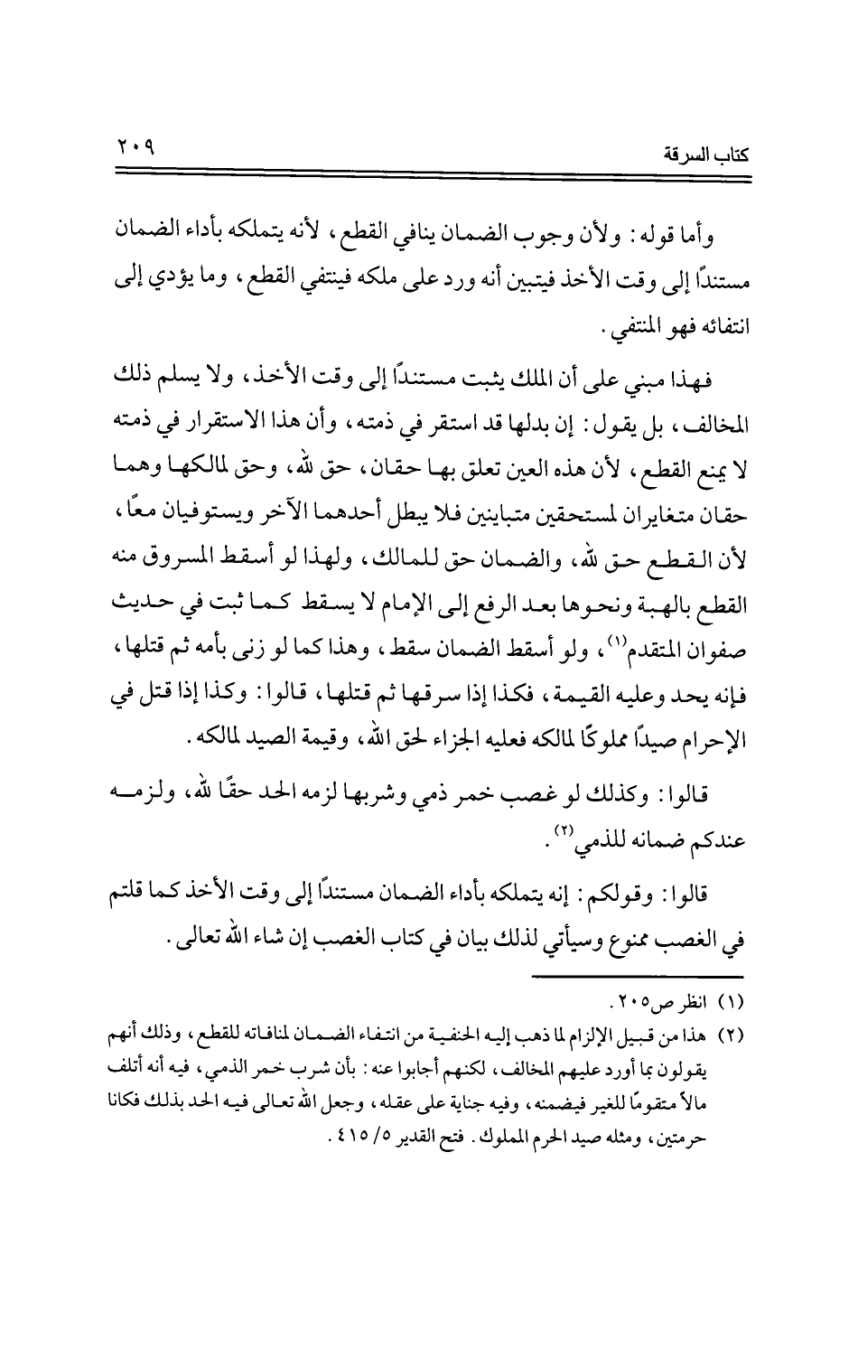 فهذا مبني على أن الملك يثبت مستندًا إلى وقت الأخذ، ولا يسلم ذلك المخالف، بل يقول: إن بدلها قد استقر في ذمته، وأن هذا الاستقرار في ذمته لا يمنع القطع، لأن هذه العين تعلق بها حقان، حق الله، وحق لمالكها وهما حقان متغايران لمستحقين متباينين فلا يبطل أحدهما الآخر ويستوفيان معًا، لأن القطع حق الله، والضمان حق للمالك، ولهذا لو أسقط المسروق منه القطع بالهبة ونحوها بعد الرفع إلى الإمام لا يسقط كما ثبت في حديث صفوان المتقدم، ولو أسقط الضمان سقط، وهذا كما لو زنى بأمه ثم قتلها، فإنه يحد وعليه القيمة، فكذا إذا سرقها ثم قتلها، قالوا: وكذا إذا قتل في الإحرام صيدًا مملوكًا لمالكه فعليه الجزاء لحق الله، وقيمة الصيد لمالكه.