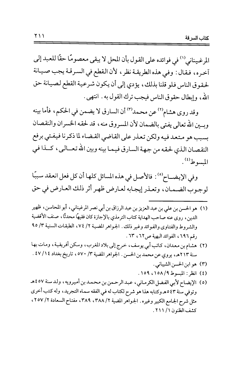 المرغيناني في فوائده على القول بأن المحل لا يبقى معصومًا حقًا للعبد إلى آخره، فقال: وفي هذه الطريقة نظر، لأن القطع في السرقة يجب صيانة لحقوق الناس فلو قلنا بذلك، يؤدي إلى أن يكون شرعية القطع لصيانة حق الله، وإبطال حقوق الناس فيجب ترك القول به. انتهى.
