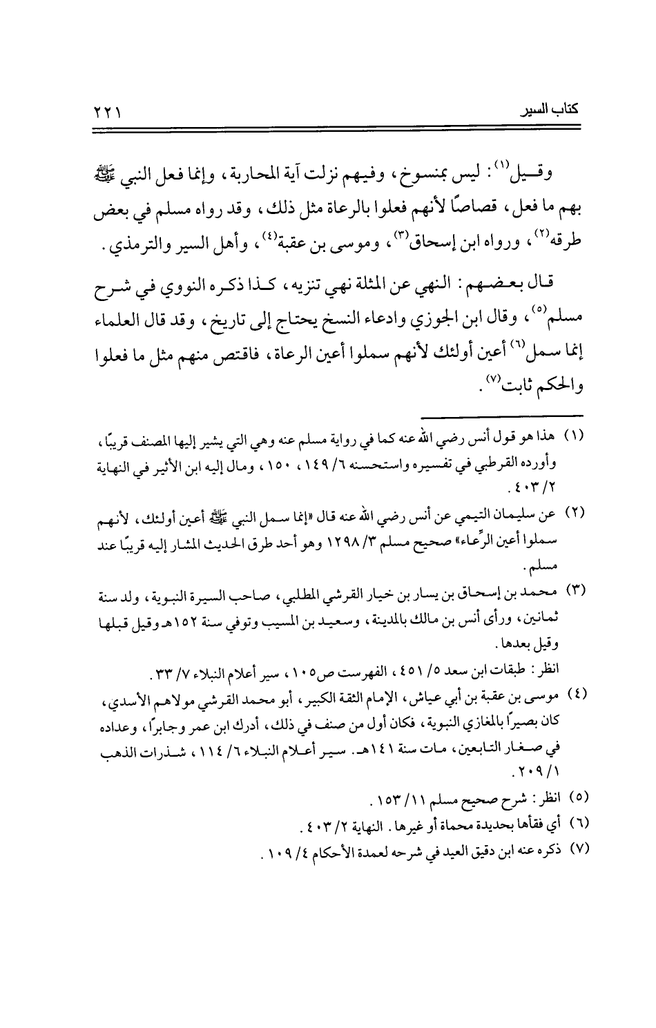 وقيل: ليس بمنسوخ، وفيهم نزلت آية المحاربة، وإنما فعل النبي -صلى الله عليه وسلم- بهم ما فعل، قصاصًا لأنهم فعلوا بالرعاة مثل ذلك، وقد رواه مسلم في بعض طرقه، ورواه ابن إسحاق، وموسى بن عقبة، وأهل السير والترمذي.