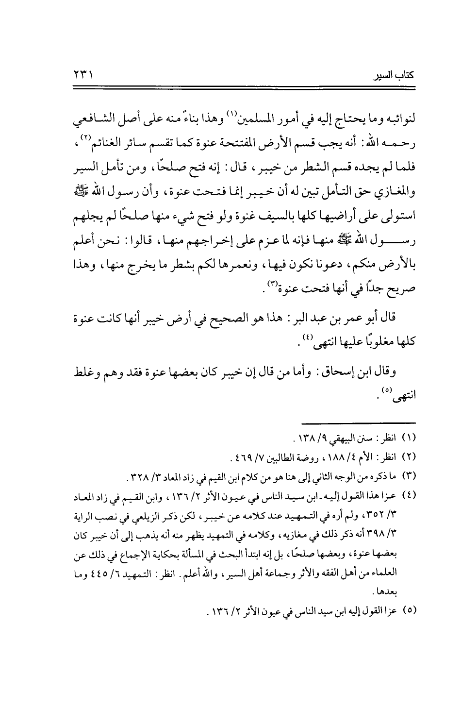لنوائبه وما يحتاج إليه في أمور المسلمين وهذا بناءً منه على أصل الشافعي -رحمه الله-: أنه يجب قسم الأرض المفتتحة عنوة كما تقسم سائر الغنائم، فلما لم يجده قسم الشطر من خيبر، قال: إنه فتح صلحًا، ومن تأمل السير والمغازي حق التأمل تبين له أن خيبر إنما فتحت عنوة، وأن رسول الله -صلى الله عليه وسلم- استولى على أراضيها كلها بالسيف غنوة ولو فتح شيء منها صلحًا لم يجلهم رسول الله -صلى الله عليه وسلم- منها فإنه لما عزم على إخراجهم منها، قالوا: نحن أعلم بالأرض منكم، دعونا نكون فيها، ونعمرها لكم بشطر ما يخرج منها، وهذا صريح جدًا في أنها فتحت عنوة.