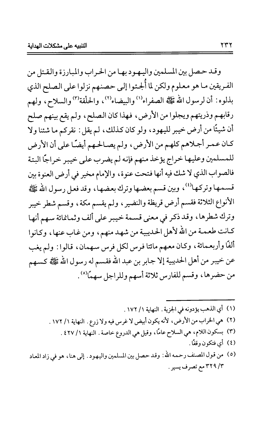 وقد حصل بين المسلمين واليهود بها من الحراب والمبارزة والقتل من الفريقين ما هو معلوم ولكن لما ألجئوا إلى حصنهم نزلوا على الصلح الذي بذلوه: أن لرسول الله -صلى الله عليه وسلم- الصفراء والبيضاء، والحلقة والسلاح، ولهم رقابهم وذريتهم ويجلوا من الأرض، فهذا كان الصلح، ولم يقع بينهم صلح أن شيئًا من أرض خيبر لليهود، ولو كان كذلك، لم يقل: نقركم ما شئنا ولا كان عمر أجلاهم كلهم من الأرض، ولم يصالحهم أيضًا على أن الأرض للمسلمين وعليها خراج يؤخذ منهم فإنه لم يضرب على خيبر خراجًا البتة فالصواب الذي لا شك فيه أنها فتحت عنوة، والإمام مخير في أرض العنوة بين قسمها وتركها، وبين قسم بعضها وترك بعضها، وقد فعل رسول الله -صلى الله عليه وسلم- الأنواع الثلاثة فقسم أرض قريظة والنضير، ولم يقسم مكة، وقسم شطر خيبر وترك شطرها، وقد ذكر في معنى قسمة خيبر على ألف وثمانمائة سهم أنها كانت طعمة من الله لأهل الحديبية من شهد منهم، ومن غاب عنها، وكانوا ألفًا وأربعمائة، وكان معهم مائتا فرس لكل فرس سهمان، قالوا: ولم يغب عن خيبر من أهل الحديبية إلا جابر بن عبد الله فقسم له رسول الله -صلى الله عليه وسلم- كسهم من حضرها، وقسم للفارس ثلاثة أسهم وللراجل سهمًا.